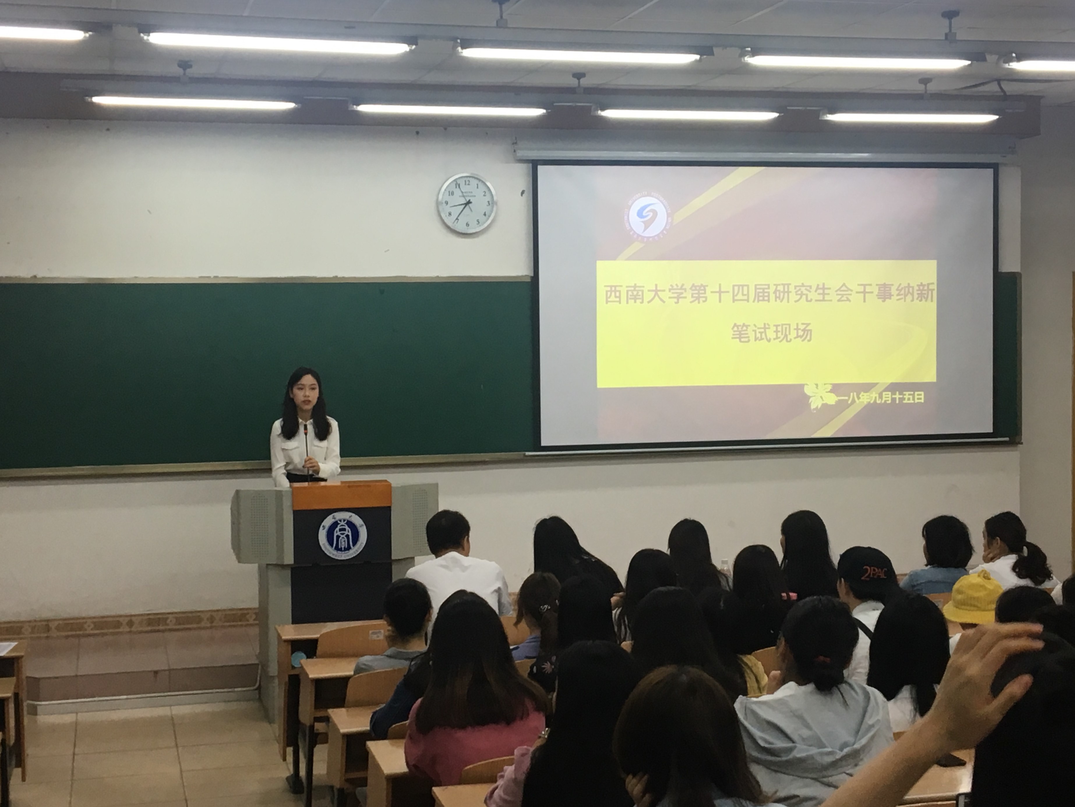 首先,学校研究生会主席姚铮同学欢迎各位新同学的到来并对本届纳新活动的情况作了简单的说明。此次招新得到了全校研究生的积极响应,共325名同学报名参加了本次活动,研会拟招收115人,录取比例约为35%。随后,她介绍了此次招新的相关要求和具体流程,让参加笔试面试的各位同学在规则之下更精彩地展示自己。最后,姚铮同学对各位同学表达了美好的期望,并预祝大家笔试面试成功!