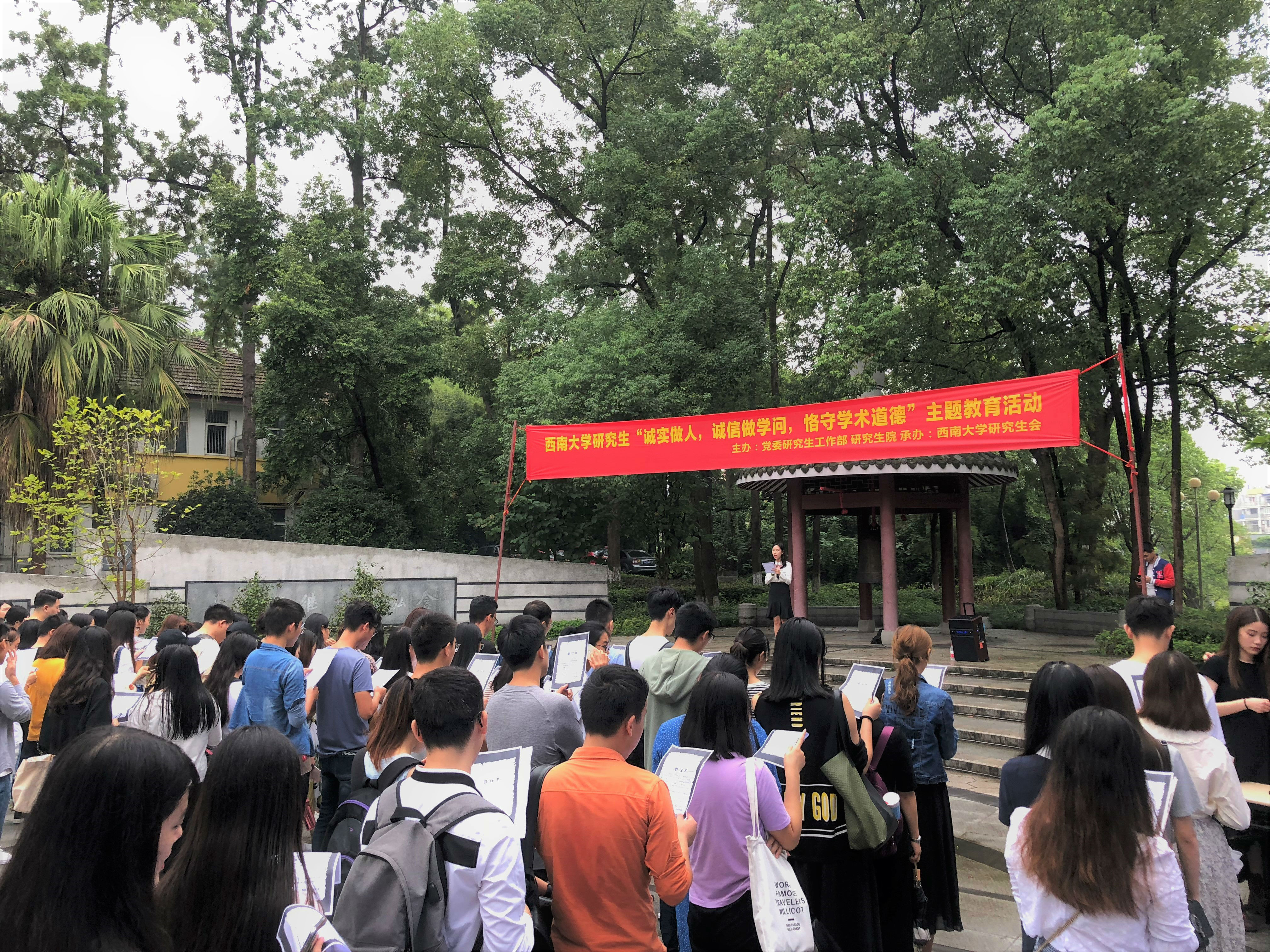 校研究生会主席姚铮同学带领与会研究生齐读倡议书,倡议全体研究生:一是要树立诚信品质,遵循学术道德,保护知识产权,求真务实、勇于创新;二是要坚决反对任何形式的抄袭、拼凑、剽窃、伪造科研成果的行为;三是要自觉抵制学位论文买卖、代写行为,勇于同不良学风作斗争,自觉维护学校及个人学术声誉,捍卫学术尊严。
