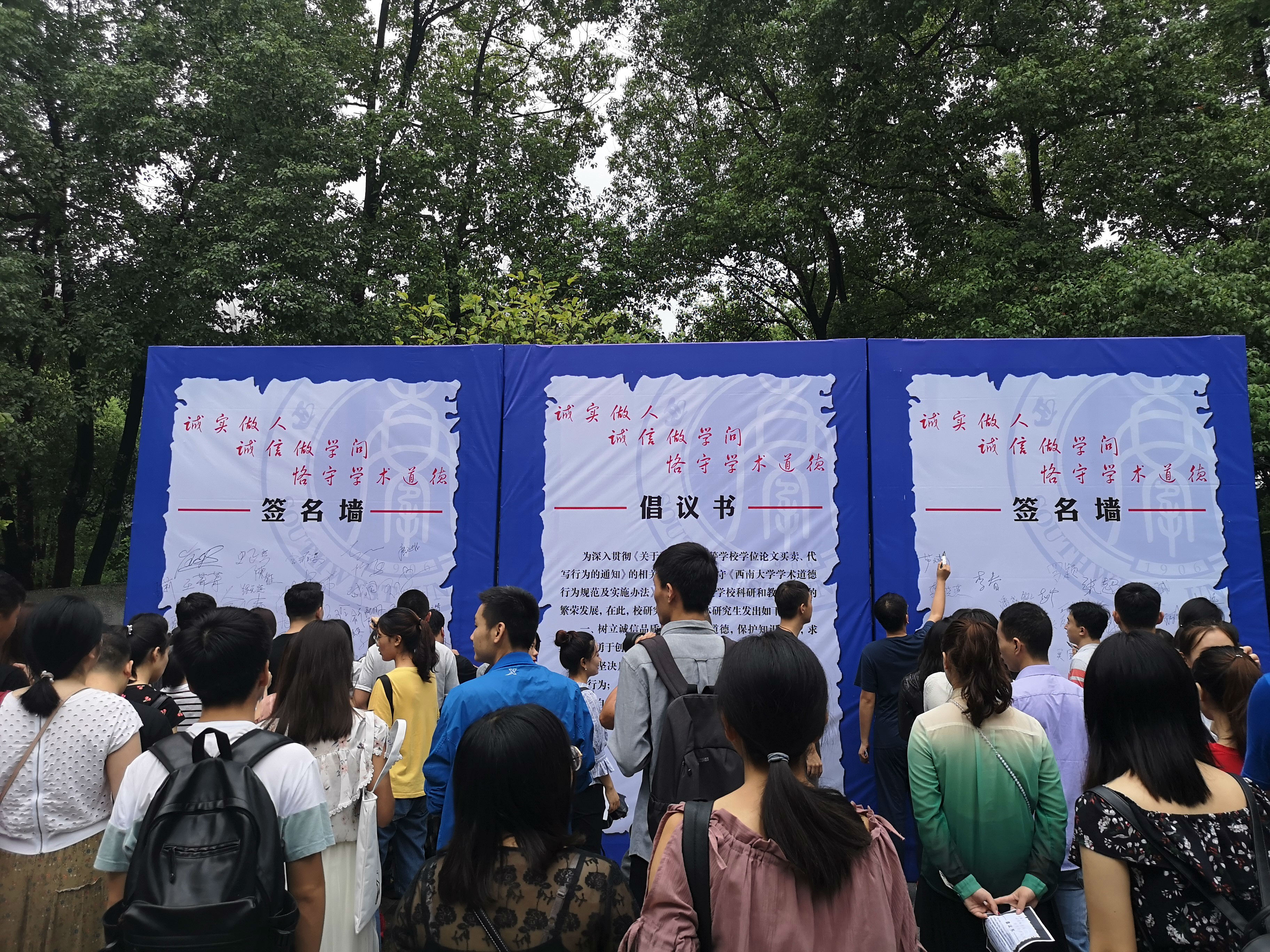 在签名活动中,学校领导、导师代表、相关职能部门领导通过签名,用实际行动支持研究生们的倡议;学校研究生会组织全校各培养单位研究生代表在签名墙上庄重地签下自己的名字,表示将用实际行动践行倡议宣言。