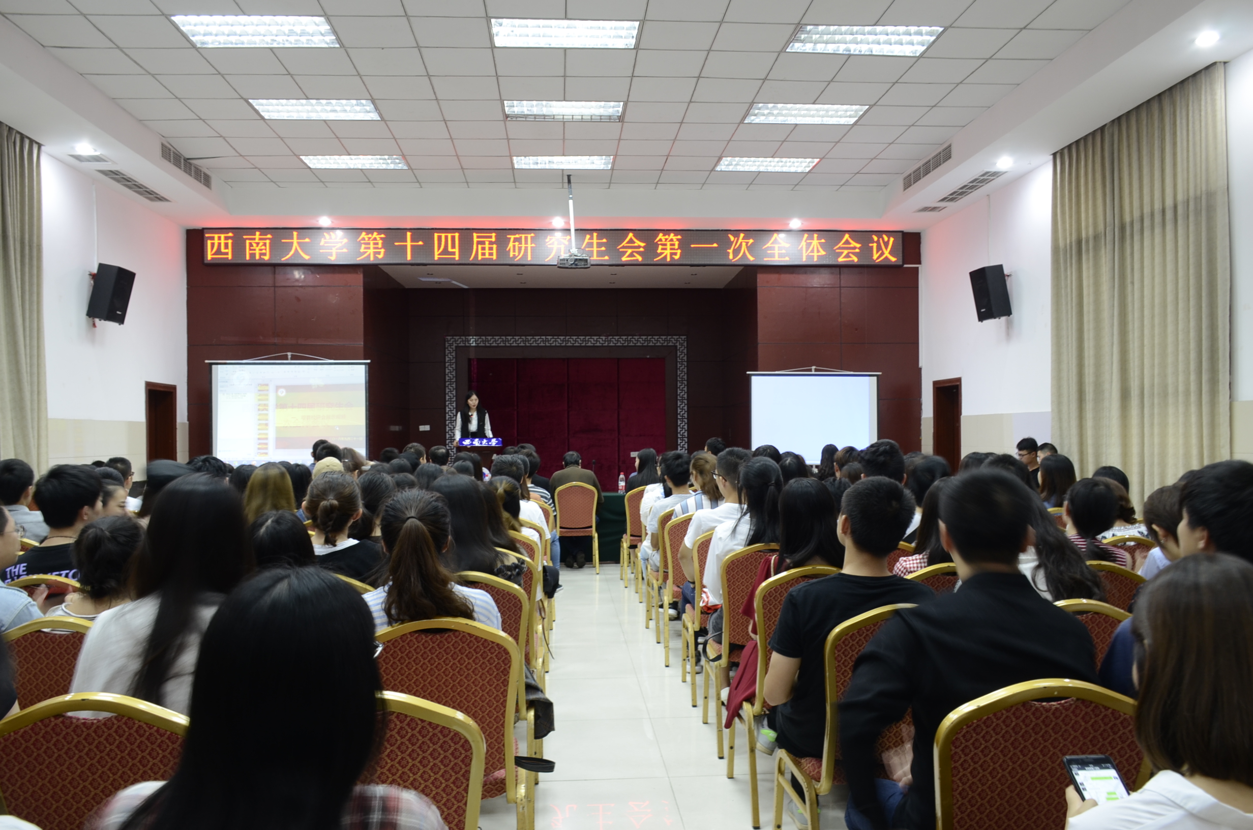 继新学期研会纳新工作完成后,9月21日下午,学校第十四届研究生会第一次全体会议在八一礼堂举行。学校党委研究生工作部、研究生院主要负责人,第十三届校研会主席团成员,第十四届校研会全体成员参会,会议由第十四届校研会副主席杨希同学主持。
