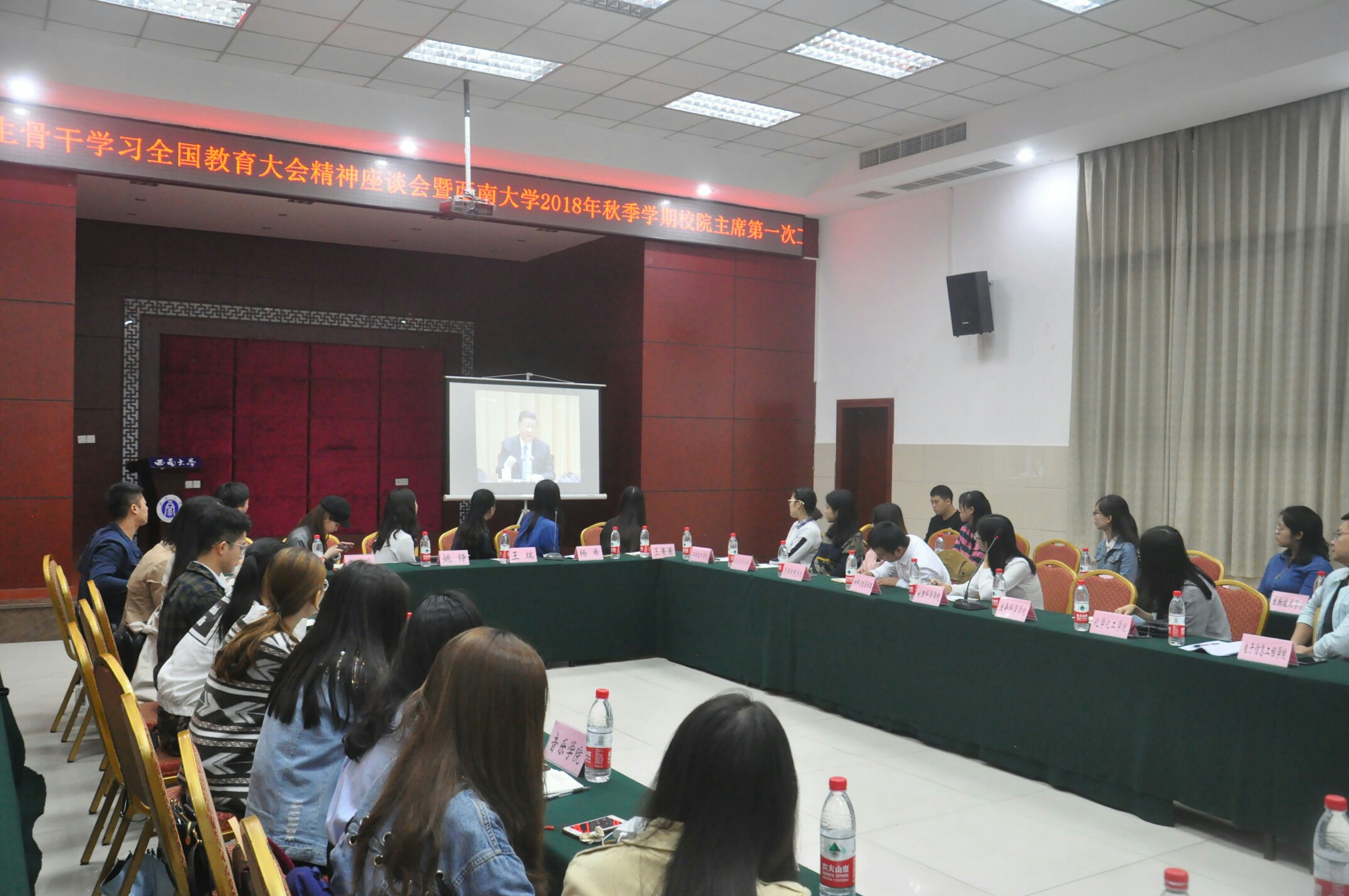 为进一步学习贯彻全国高校思想政治工作会议精神,加强研究生会在思想政治教育工作中的作用,9月28日上午,研究生骨干学习全国教育大会精神座谈会暨2018秋季学期校院研会主席第一次工作例会在八一礼堂举行。学校第十四届研究生会主席团及各二级培养单位研究生会主席参会,会议由校研会副主席杨希同学主持。