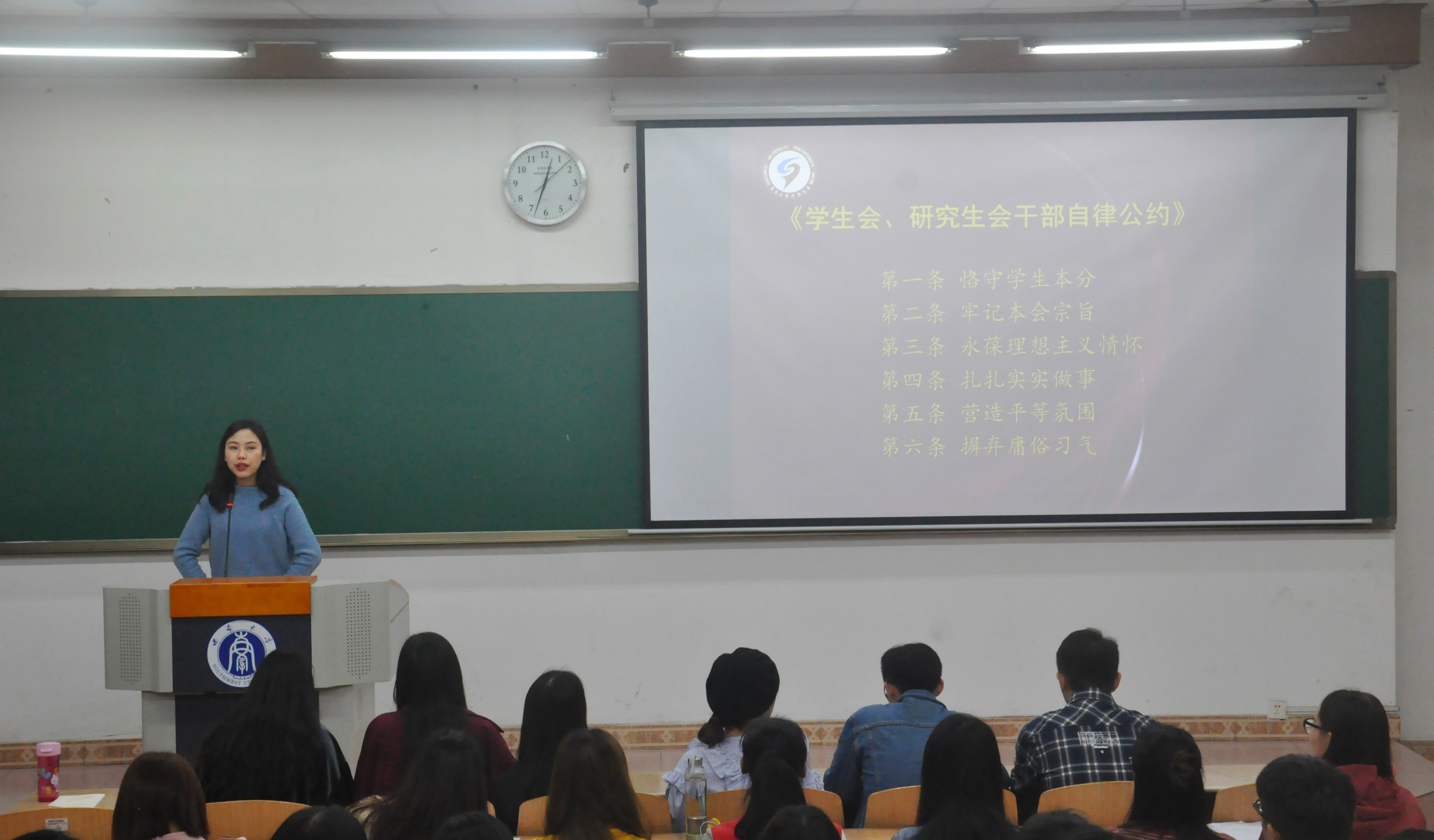 会上,校研会主席姚铮同学提出,要建设一支胸怀理想、心系同学、品学兼优、作风扎实的工作骨干队伍,共同维护组织形象,认清学生会、研究生会干部的职能权利和义务,确保更好履行工作职责。她带领全体与会人员学习并朗读《学生会、研究生会干部自律公约》,倡导恪守学生本分,牢记本会宗旨,永葆理想主义情怀,扎扎实实做事,营造平等氛围,摒弃庸俗习气。