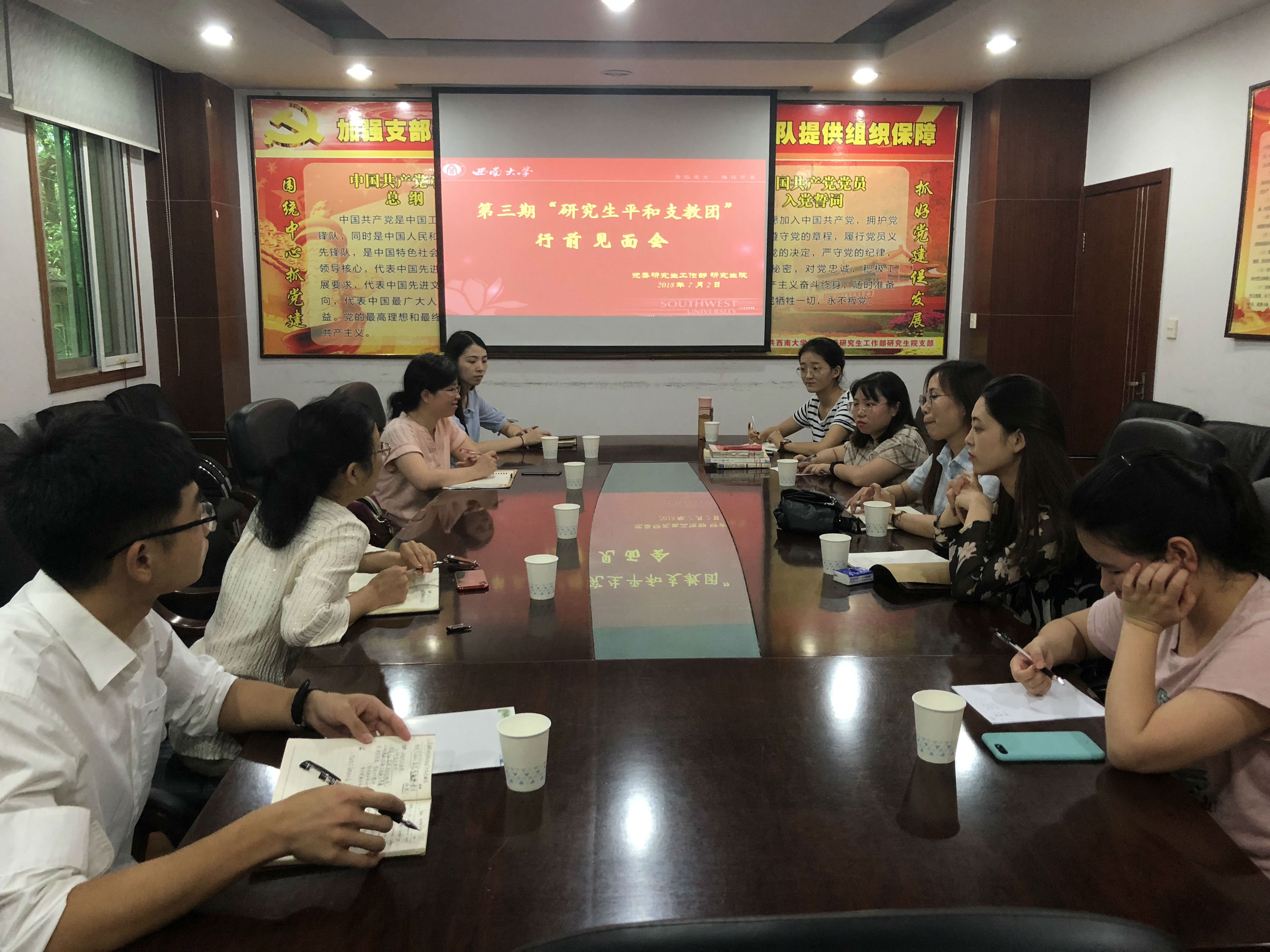 7月2日,学校第三期“研究生平和支教团”行前见面会在研究生院顺利举行。研究生院副院长涂涛老师、专业学位办主任黄漓红老师、思政办主任吴睿老师、支教团指导老师黄宇出席会议,第三期支教团成员悉数到场。