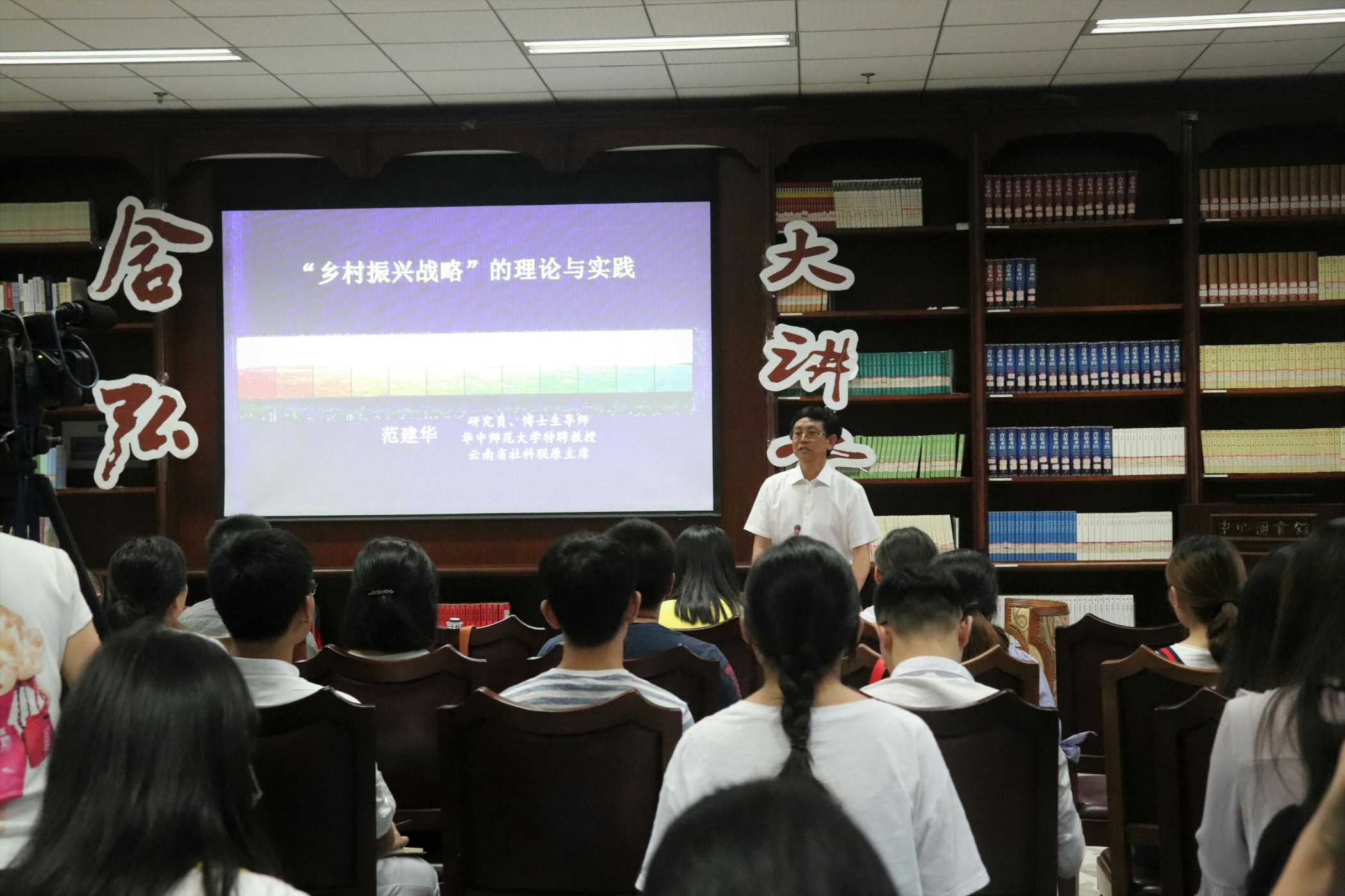 6月3日晚,原云南省社科联主席导范建华研究员应党委研究生工作部、betway西汉姆联民族理论与政策评估研究中心邀请,依托含弘大讲堂平台,为学校研究生会骨干、“香樟计划”成员以及相关专业的老师、同学带来了一场题为《“乡村振兴战略”的理论与实践》的讲座。betway西汉姆联历史文化学院田阡教授主持了本次活动,80余位老师、同学在中心图书馆聆听了报告并参与讨论。