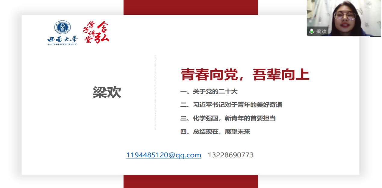 化学化工学院主讲人梁欢同学以“青春向党,吾辈向上”为题,分享了习近平总书记在中国共产党第二十次全国代表大会上对青年的美好寄语,鼓励同学们要做“有理想、敢担当、能吃苦、肯奋斗”的新时代好青年。她还将党的二十大精神融入学科中,并表示:对于化学化工学科来说,新青年的首要担当就是化学强国,要努力提高专业能力和创新能力,肩负化学传播的使命,昂首奋进新时代,同心共筑中国梦。