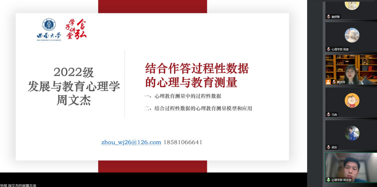 心理学部主讲人周文杰同学分享的主题是“结合作答过程性数据的心理教育测量”。通过传统测验与计算机化测验的对比,他明确了过程性数据的重要性,同时介绍了几种基于项目反应理论框架、需结合过程性数据来帮助测验本身更好识别作答者能力的技术,并进一步揭示了过程性数据背后的潜在特质与能力之间的关系,这种注重过程性数据的研究方法对于各学科开展科研工作都有较大启发。