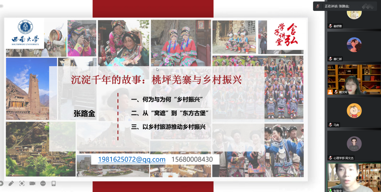 地理科学学院主讲人张路金同学分享的主题是“从空间联系和平衡中解读乡村振兴的原因、意义与重点”。他从何为乡村振兴以及为何要乡村振兴入手,结合心理学的感知系统知识,通过洞察桃坪羌寨的崛起,从人文地理学角度探讨了如何进行乡村振兴、如何推动地区经济发展的重要问题,为乡村振兴战略提供了宝贵建议。
