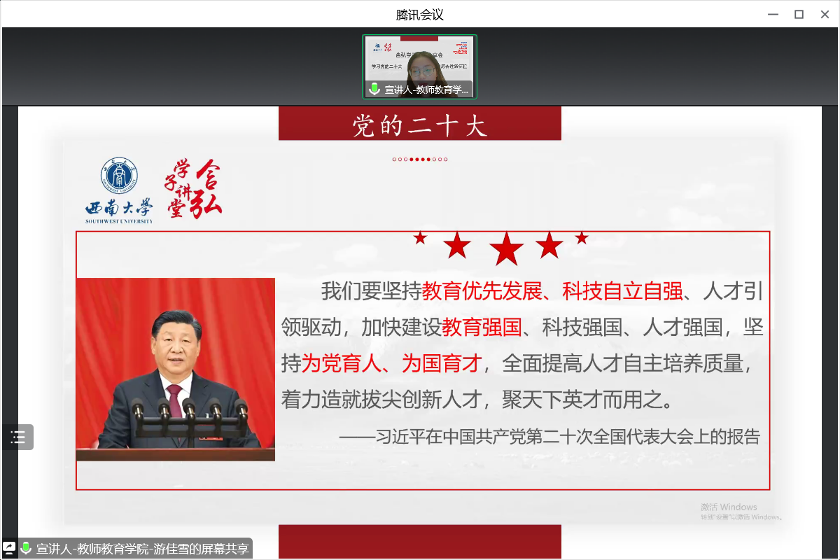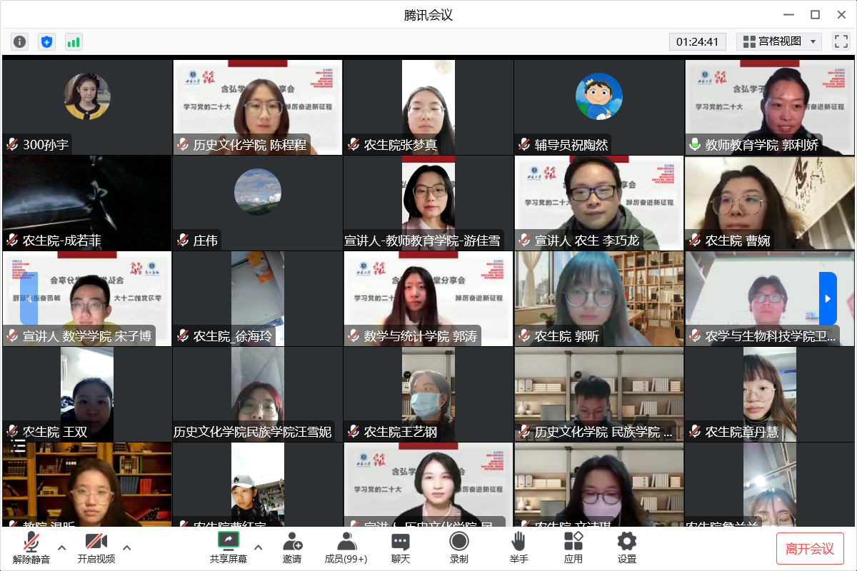 2022年12月10日晚7点,由betway西汉姆联研究生会主办,教师教育学院研究生会、农学与生物科技学院研究生会、历史文化学院 民族学院研究生会、数学与统计学院研究生会联合承办的含弘学子讲堂之“学习党的二十大,踔厉奋进新征程”分享会在线上圆满举行。本次分享会由历史文化学院 民族学院的陈程程同学主持,共有四名宣讲人参加,各学院研究生辅导员受邀担任嘉宾。