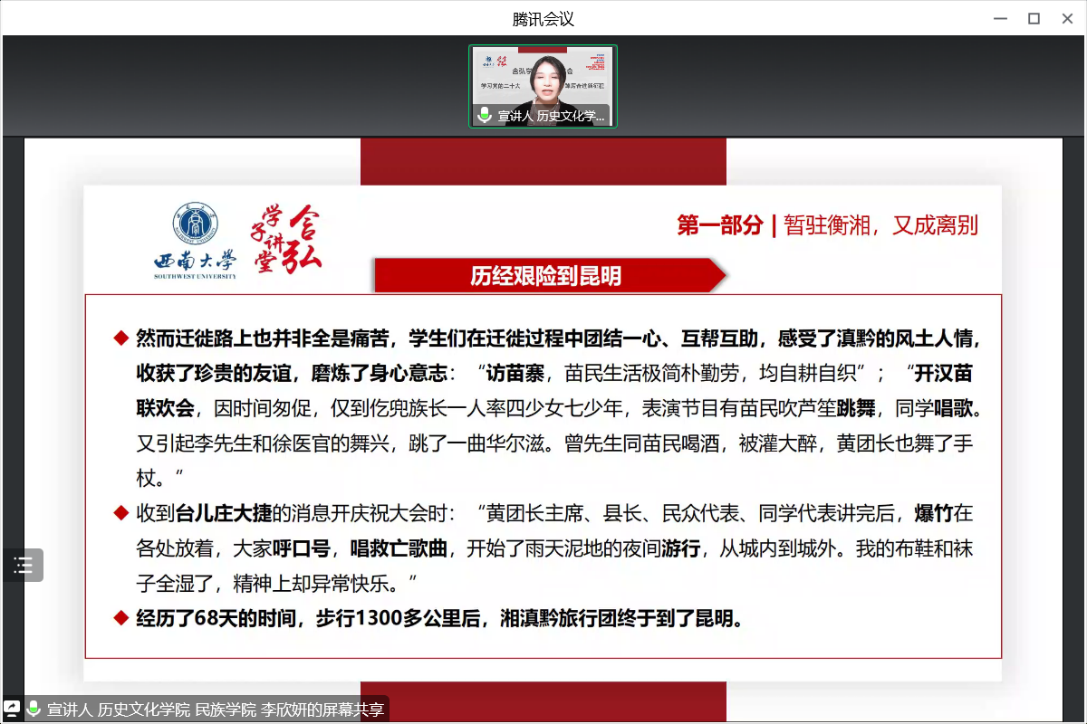 历史文化学院 民族学院2021级中国史专业的李欣妍同学在分享中提出:青年在新征程的路上要不忘初心就要做到不忘先辈奋斗历史。她结合专业所长,为大家讲解了国立西南联合大学从“痛南渡,辞官阙”到“神京复,还燕碣”的曲折故事,弘扬了西南联大师生的文化风骨和家国情怀。