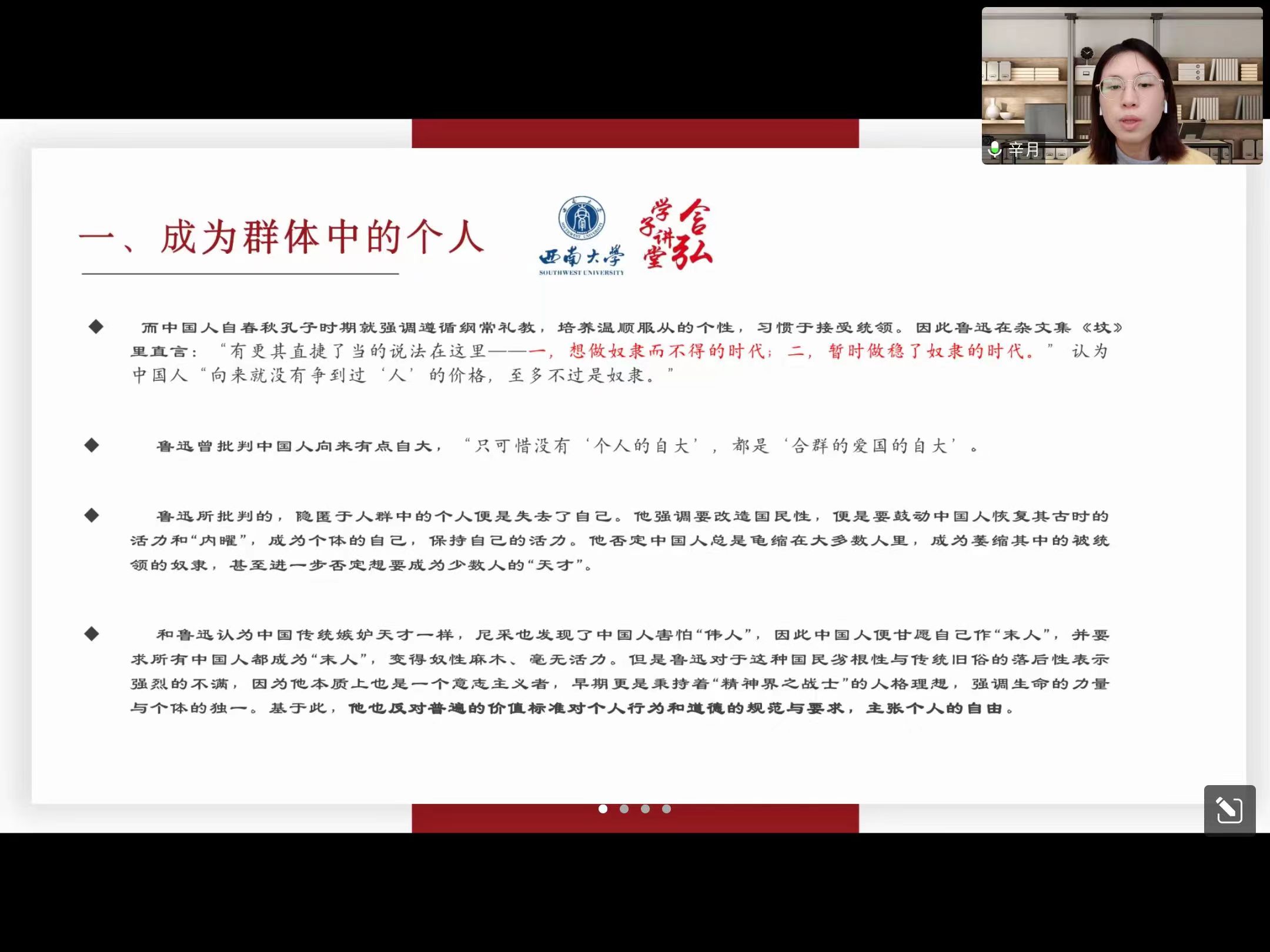 辛月同学从西方重要理论家尼采的思想出发,分析了中国现代著名作家鲁迅感叹中国“做奴隶而不得”的思想路径。她认为尼采的权力意志表明一切力量都是在寻求强大,要求吞并和成为主人,这种快乐和欲求同时出现在强者和弱者的身上。鲁迅所言虽是百年前的中国现状,但是回首当下,这种自欺的、合群的奴隶精神又何尝不是现代人所有,述说鲁迅其实也是在诉说我们自己。