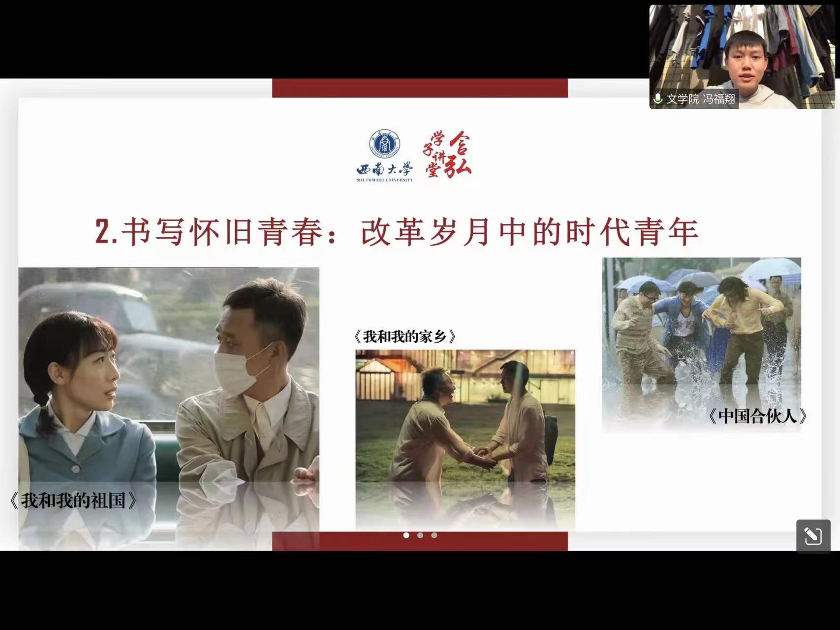 冯福翔同学从影片实例出发,分析了银幕青年形象的发展与变迁。他认为新时代主旋律电影将青年形象置于前景,展现了当下中国青年的朝气活力与使命担当,成为新时代主流文化与青年文化相互交融、良性互动的确证。在“新主流电影”的创作范式下,银幕上涌现出“风云激荡中的革命青年”“改革岁月中的时代青年”“强国征程中的当代青年”三种创作路径,这些路径是当下中国社会“后喻文化”倾向的应时体现。