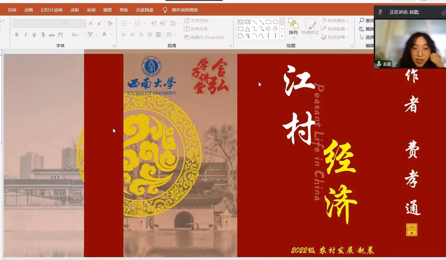 赵晨分享了《江村经济》一书,该书是费孝通以人类学的方法对江苏吴江开弦弓村调查研究的成果,旨在通过人类学的视角展现我国传统农村社会的深层结构和功能。她首先介绍了这本书的作者费孝通在开弦弓村进行调查的背景和过程,然后着重讲述了这本书第十二章蚕丝业的精彩片段,描绘了在工业革命和蚕丝价格不断下跌的背景下开弦弓村是如何进行改变和自救的。最后,她认为:躬身实践才能有真知灼见,我们要大力弘扬费老的“江村精神”,用自己的双脚来丈量国家。