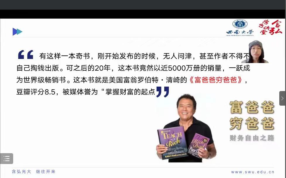 蒋涵月分享了《富爸爸穷爸爸》一书,该书讲述了经济状况相反的两个爸爸截然不同的金钱观和财富观。她首先介绍了本书的宏观背景,通过引入一个个妙趣横生的故事,为大家解密金钱的运行规律。随后,她分享了书中“拴住人的老鼠赛跑陷阱”等五个真实现实,从多个角度让同学们体验到了经济学当中的哲学思维。最后,她激励同学们培养自己的“财商”,改变盲目从众的固化思维,抵制缺乏行动力的“内耗模式”,让金钱为人工作。