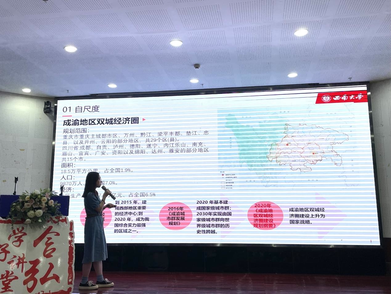 地理科学学院2022级人文地理学专业的衡舒雅同学以“地理学尺度下的成渝地区双城经济圈建设”为题,介绍了成渝双城经济圈规划及发展现状,重点讲解了同城化、区域一体化建设及生态保护协同建设,并通过国内外经济圈对比,突出了成渝地区双城经济圈发展优势。最后,她还通过生活案例,调动了同学们的积极性,生动呈现了成渝双城经济圈建设对社会生活的重要意义。