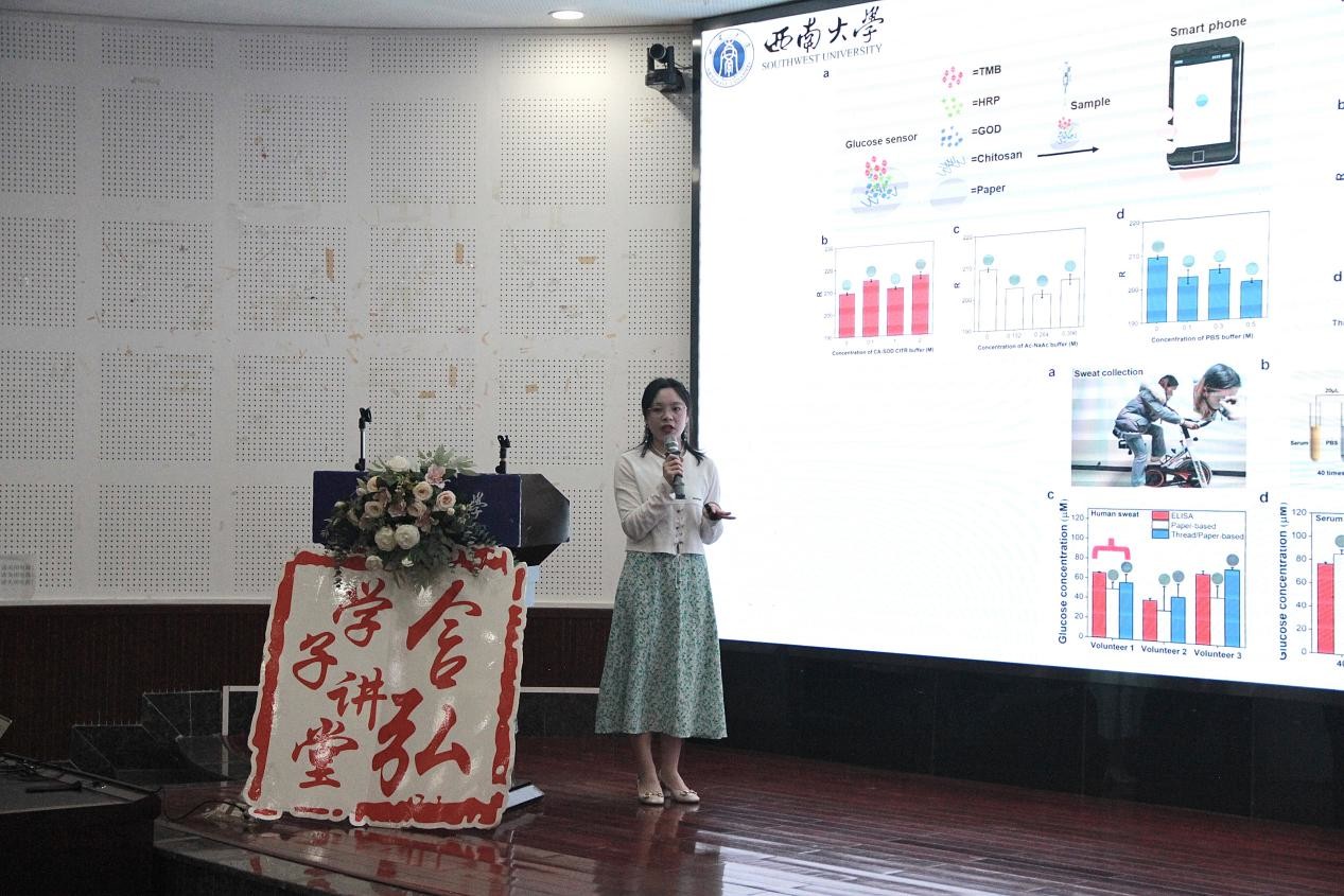 材料与能源学院2021级纳米生物医学专业的熊静同学从人体运动与健康角度出发,讲述了汗液与纤维/织物碰撞出的“火花”,分享了功能化纤维/织物在汗液生物分析、汗液激发自供能传感方面的原理逻辑。