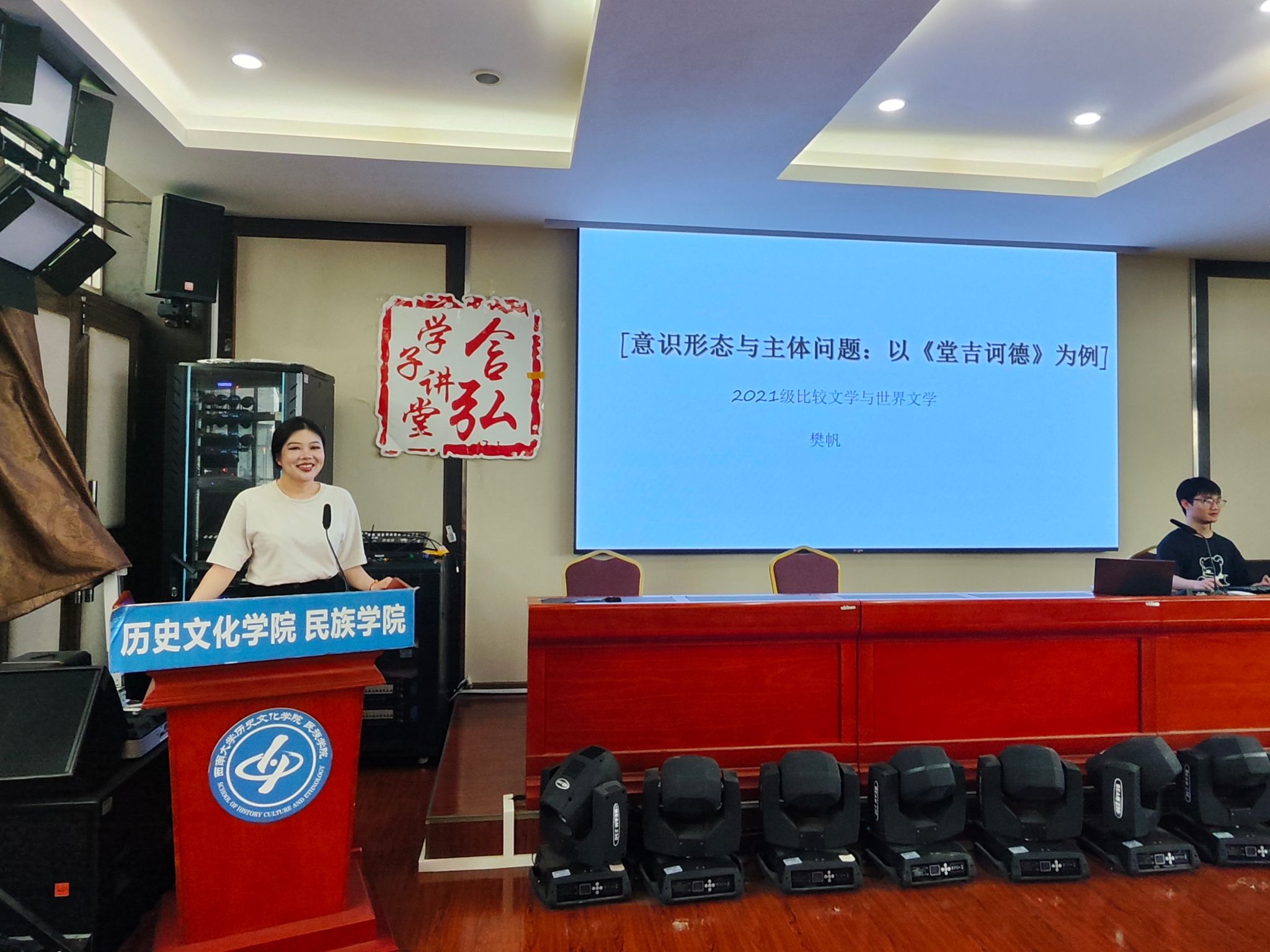 樊帆同学以“意识形态与主体问题:以《堂吉诃德》为例”为题,开篇引用了党的二十大报告“建设强大凝聚力和引领力的社会主义意识形态”,阐明了我国意识形态建设的重要性,接着具体分析了意识形态的内涵、意识形态作用于人的机制、知识分子的自我身份认同等问题。最后,她引用了习近平总书记在全国抗击新冠肺炎疫情表彰大会上中的讲话,“人无精神则不立,国无精神则不强。唯有精神上站得住、站得稳,一个民族才能在历史洪流中屹立不倒、挺立潮头”,以此彰显意识形态建设对于我国社会主义建设的重要意义。