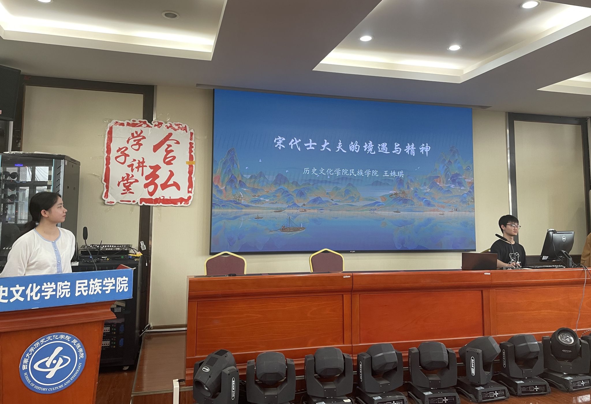 王姝琪同学以“宋代士大夫的境遇与精神”为题,从传统文化价值、宋代士大夫精神、宋代士大夫的政治境遇、宋代士大夫的精神世界四个部分展开分享,对宋代士大夫精神的成因、表现和特质进行探析,总结认为宋代是士大夫主体意识最为觉醒和人格精神最为高扬的时代。此外,她还指出,宋代士大夫所铸就的以天下为己任、先忧后乐等精神情怀是挺起中华民族坚强不屈、百压不垮民族脊梁的精神支持,也是推动中华民族前行的不竭动力。