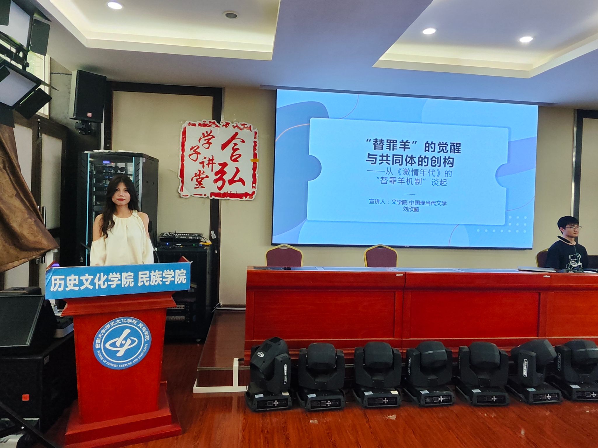 刘欣懿同学以“‘替罪羊’的觉醒与共同体的创构——从《激情年代》的替罪羊机制谈起”为题,通过讲解由美国戏剧大师阿瑟·米勒的经典剧本《萨勒姆的女巫》改编的影片《激情年代》中的“替罪羊机制”,揭示出外壳下荒诞的集体暴力是比流血更为深刻的人性苦难,并寻求在“上帝已死”的现代文明中重建一种理性共责的共同体秩序。在最后的结语反思中,她也对人类命运共同体的构建提出了自己的理解,并认为只有坚持以真理为先的集体秩序、倡导同舟共济的理念,才有可能告别“替罪羊机制”的伦理悲剧,拥有更为光明的可能。
