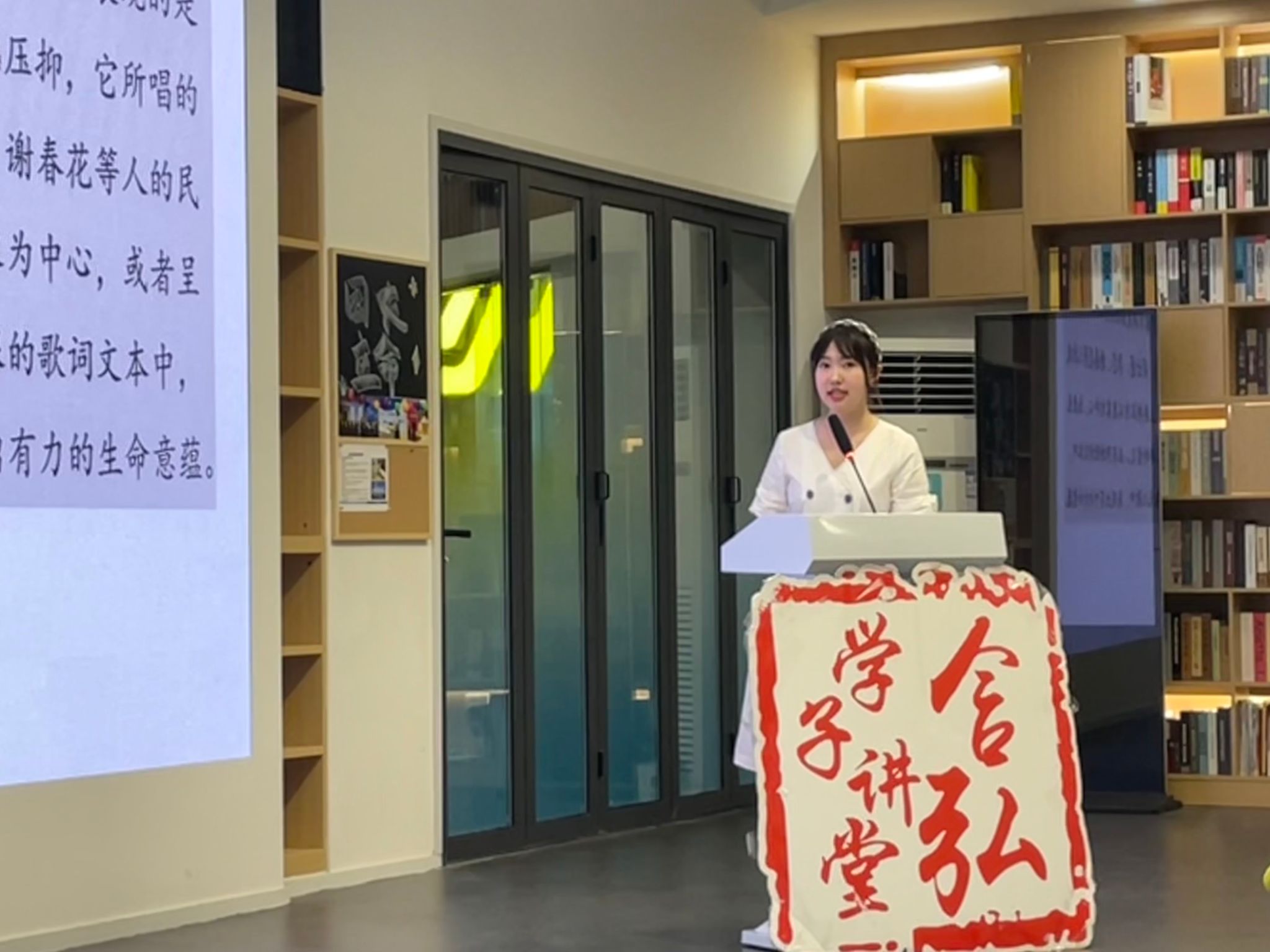 吴岐雯同学通过对新民谣前世今生的书写和对新民谣歌词中生命意象的分析,向大家阐述了新民谣歌词中的生命意识。这种生命意识在作品中体现为对个人化情感的张扬和对理想生命状态的自觉追求。最后,她呼吁大家坚定文化自信,坚守中华文化的立场,从而才能更好地讲好中国故事,传播好中国声音。