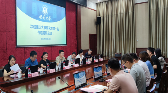 9月14日下午,重庆大学研究生院副院长张育新一行7人到我院调研交流。研究生院副院长杨丹,招生办公室、学术学位培养办公室、专业学位培养办公室、学位办公室、质量监督与信息科负责人参加座谈。双方就推进落实国家中小学优秀教师培养计划(以下简称‘国优计划’)有关事宜进行了深入交流。