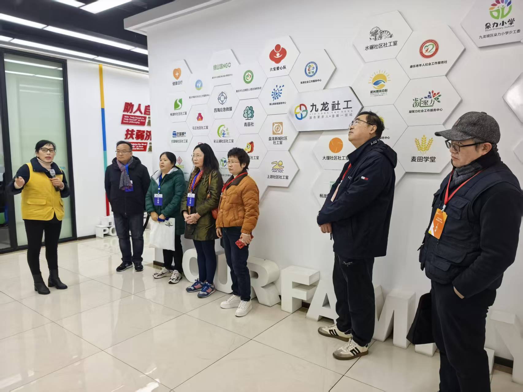 首先,调研人员在九龙坡区九龙社会工作服务中心党支部书记、主任陈会兰的带领下参观了中心的工作环境。陈会兰书记向众人介绍了中心发展情况、基地建设情况、基地规模、项目申报及实施工作、基地帮扶模式以及服务保障内容等,以视频的形式展现了基地的工作方式及内容。中心于20194月建成,目前已培育社会工作人才372人、社区社会组织295个、注册志愿者4万余名,实施市、区、街道购买项目599个,投入项目资金985万元,开展公益服务活动5000余场次。2021年,与betway西汉姆联签约,成为专业学位研究生联合培养基地。