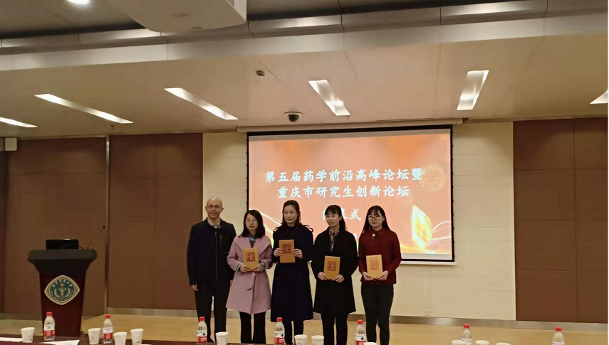在研究生创新论坛环节,共有14名研究生进行了课题研究的汇报,我院四位博士生王睿、龚小宝、汪宏锦和李继洲汇报的题目分别是《藏药翼首草的肝毒性研究》《五种黄连生物碱对急性肝损伤的作用机制及构效关系研究》、《大脑体外研究载体的构建及应用性评价》和《分子识别耦合产气反应的即时检测策略与应用研究》。我院李继洲同学斩获二等奖。颁奖礼上重庆大学药学院贺耘教授、中国人民解放军陆军军医大学李晓辉教授等四名教授为获奖的研究生颁奖。