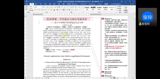 王小华、邹宝玲两位老师在学术沙龙前仔细阅读两位博士生的论文并为两位同学的论文做了十分详细的修改批注,学术沙龙活动中,两位老师从学术论文规范、研究方法和研究范式、学术界对多维贫困和经济集聚的研究前沿和权威内容等方面,提出大量论文修改的建议。两位老师都非常强调论文的学术规范,包括论文排版、论文引用格式、专有名词准确性等,指出做研究一定要培养良好习惯,注重细节。王小华老师向郝坚介绍国内外学术界研究多维贫困的权威专家和论文,强调一定要多阅读研究领域具有代表性的学术成果;王小华老师和兰秀娟围绕模型建立、结果运用等研究的具体方法进行深入细致的讨论。邹宝玲老师向郝坚介绍宗族文化方面具有代表性的文献,围绕如何提出研究问题提供了具体的思路;邹宝玲老师点评兰秀娟的论文时,围绕概念的界定、变量的选取以及研究对象的数据来源等一一细致点评,指出当前研究存在的不足和改进的方法。两位老师在点评过程中展现了宽广的学术视野和深厚的学术积淀,他们多次强调,要多阅读文献、多思考问题、多动笔写作,才能真正做好研究、写好论文。