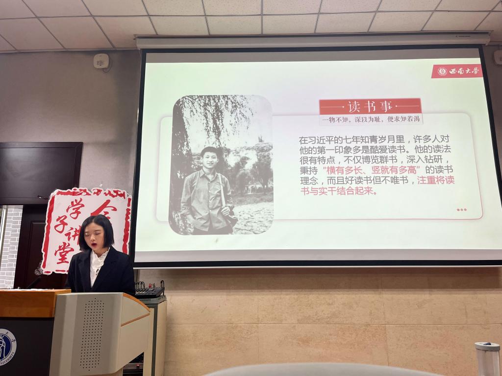 在首届全民阅读大会开幕式上,习近平总书记发来贺信:“希望广大党员、干部带头读书学习,修身养志,增长才干;希望孩子们养成阅读习惯,快乐阅读,健康成长;希望全社会都参与到阅读中来,形成爱读书、读好书、善读书的浓厚氛围。”周婉婷同学以习近平总书记的读书之道为题分享了我国2021年的全国国民阅读现状,她希望大家能够以读书对抗焦虑,养成“爱读书、读好书、善读书”的阅读习惯。