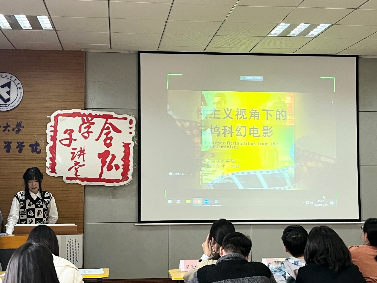 谢子涵同学就女性主义视角下的好莱坞科幻电影展开讨论。提出西方科幻电影一度是围绕西方的白人男性的神话,但随着社会进步及思想解放,多样化女性形象展现在银幕前,以不同的方式走向全面的革新。在早期科幻电影中,女性往往带有花瓶式的刻板印象,甚至有妖魔化之嫌。再后来科幻电影中的女性角色仍摆脱不了传统女性的特征。直至后现代女性主义发展,女性从觉醒走向全面革新,正逐渐向真正的独立个体形象的方向发展。最后,谢子涵同学呼吁大家理性沟通,共同建设平等社会。