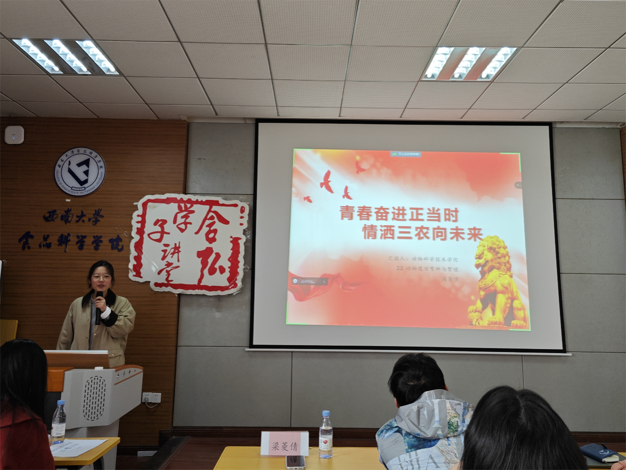 梁菱倩同学分享的主题是“青春奋进正当时,情洒三农向未来”。她首先讲解了建设农业强国,推进乡村振兴的深刻内涵,指出农业强国是社会主义现代化强国的根基。随后,通过二十大报告对乡村振兴在近阶段的主要任务做出的全面部署,论证建设农业强国是推进乡村振兴的必由之路。最后,她以建设农业强国,推进乡村振兴是当代青年的担当来升华主题,号召青年人在乡村振兴的大舞台上建功立业,在大有可为的乡村大显身手。