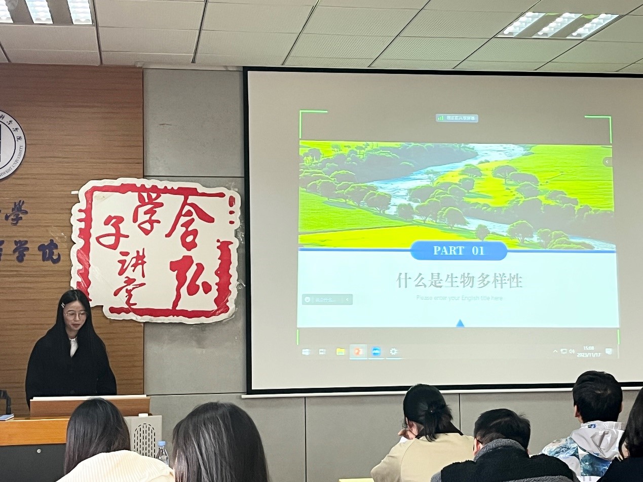 李会凤同学交流的主题是“保护生物多样性,科学治理环境”。首先,她向大家介绍什么是生物多样性,并以丰富的图片介绍了我国十大濒危动物品种。随后,讲述了动物濒危的原因及如何保护濒危动物,李会凤同学列举了五条有效的措施,并分享了三条科学治理环境相关案例。最后,提出对于建设生态文明,指出我们可以怎么做,强调生态文明是人民群众共同参与建设共同享有的事业。