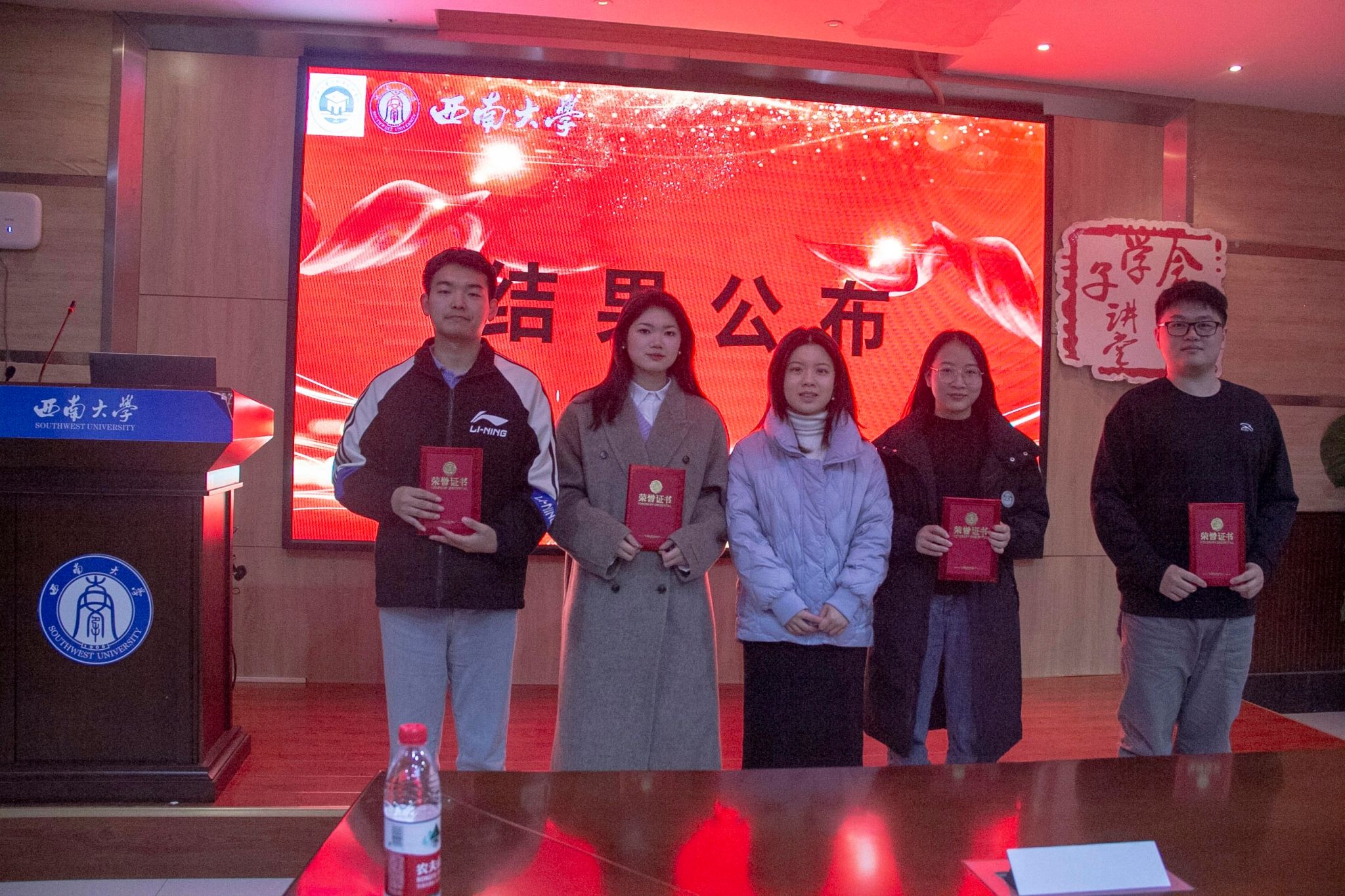 本次学术报告分享会,全体参会成员通过基本素质、语言表达、演讲内容、综合印象四个方面对四位主讲人分别进行评分,通过评分排名最终确定莫才清同学荣获一等奖,吴限晔同学荣获二等奖、赖欣和陈一凡同学荣获三等奖。研究生辅导员成果垒老师出席此次活动并为获奖同学颁发证书,她指出通过学术分享报告,大家充分展示了各自领域的研究成果,希望各位同学能在互鉴交流中碰撞思想火花,在博览探索中体现学科交融,在科研道路上发光发热。