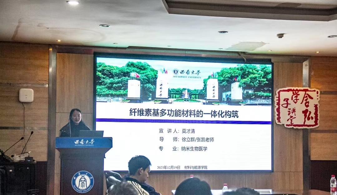 莫才清同学在《纤维素基多功能材料的一体化构筑》中聚焦于纤维素的环保和多功能性。她介绍了一种将醋酸纤维素和多壁碳纳米管与天然皮革结合的策略,用于制备具有热辐射特性的织物,旨在应对全球高温高湿的极端气候。这种纤维素基材料通过光热转化、光热蒸发和辐射制冷途径,实现了零能耗、零排放的热湿度调节。