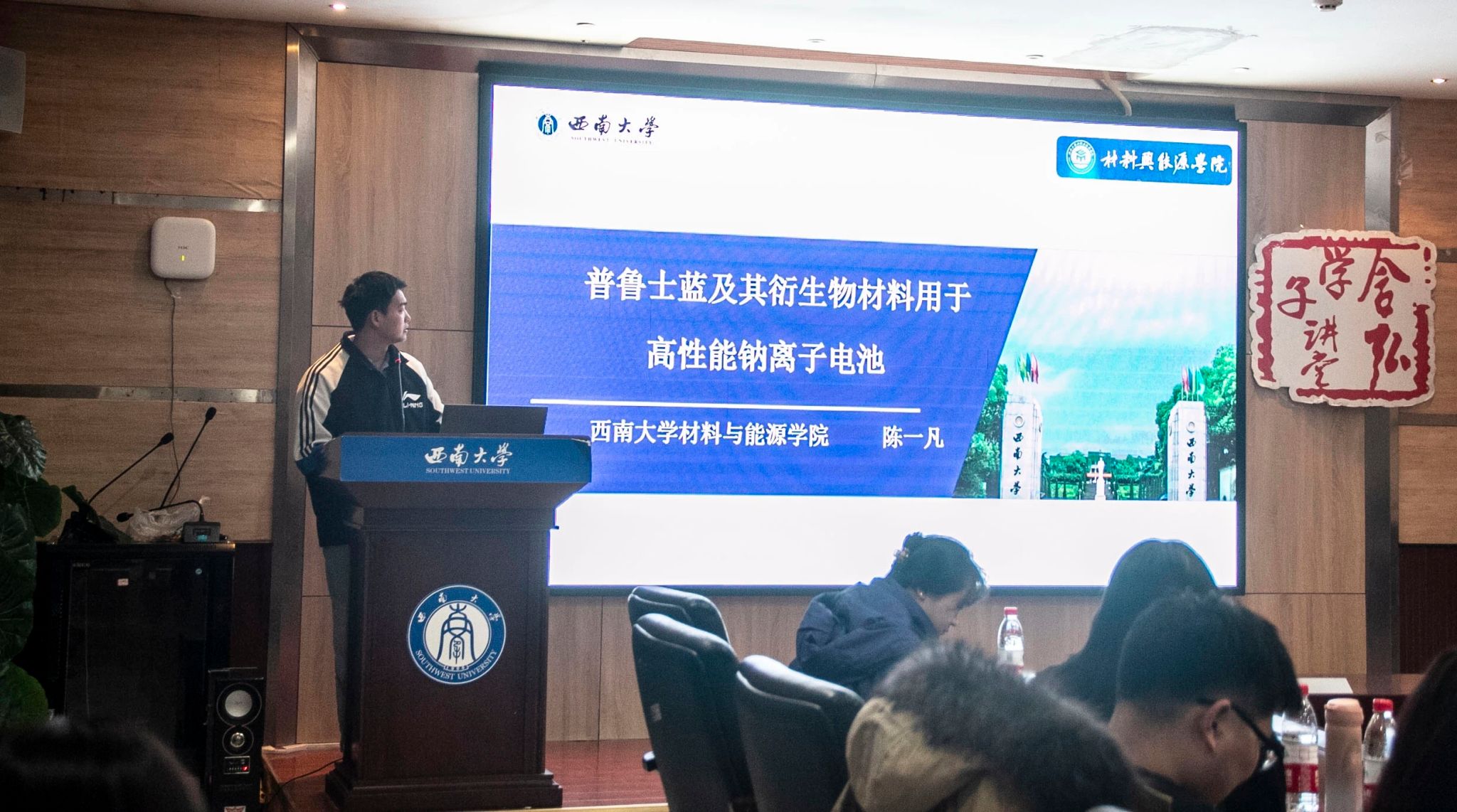 陈一凡同学的报告《普鲁士蓝类似物材料用于高性能钠离子电池的研究》深入探讨了钠离子电池作为锂离子电池替代品的潜力,着重于普鲁士蓝类化合物的特性,如独特的开放框架结构、丰富的储钠位点和较大的钠离子迁移通道,这些特性使其成为优异的储钠材料。然而,普鲁士蓝类似物在合成过程中易产生结晶水和结构缺陷,影响其电化学性能。他介绍了通过合成优化、表面改性和复合技术来解决这些问题,从而提高材料性能和稳定性。