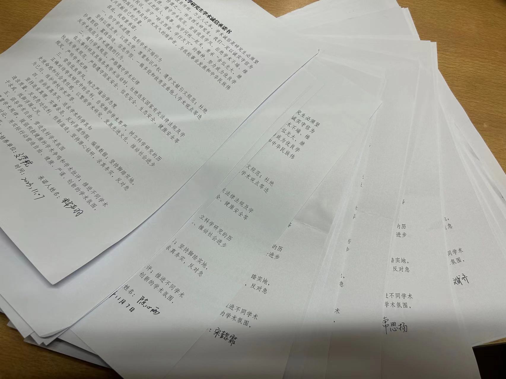 入学之初,文学院就邀请文学院院长王本朝教授、文学院副院长寇鹏程教授、学校期刊社韩云波教授等老师就论文写作与学术规范等问题开展讲座。在本单位研究生学风建设月系列活动期间,以党课党日形式组织学生开展线下学风讨论活动。同学们就“如何理解一个学校的学风?”“学风建设的重要性是什么”等问题展开了充分讨论。并在各专业签写学术诚信承诺书。