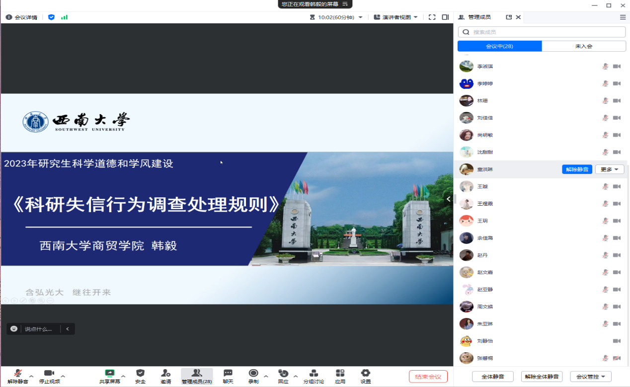 为进一步规范科研行为,杜绝科研失信行为的出现,2023年11月16日,商贸学院副院长韩毅教授通过腾讯会议集中讨论的方式带领全体研究生对《科研失信行为调查处理规则》文件精神进行了深入学习。从文件的背景、科研失信行为的认定、处理措施、流程环节等方面进行了解读。同时,韩院长勉励大家会后认真领会文件精神,多思考文件中的重点,端正态度,清思想之源,正规则之本,努力提高思想认识,增强科研诚信意识,坚守学术道德和科研伦理,切实践行学术规范。