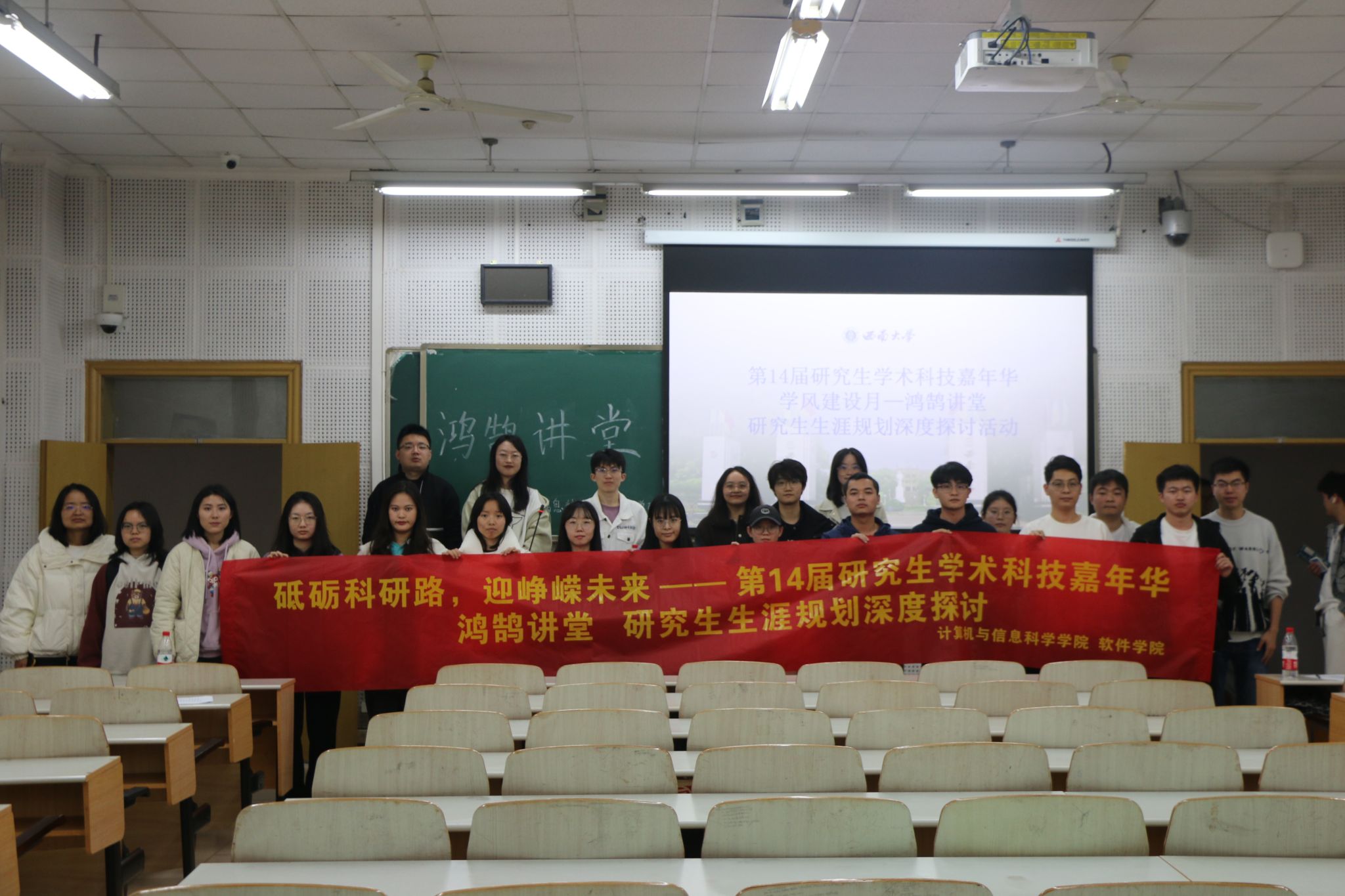 计算机与信息科学学院 软件学院以“砥砺科研路,迎峥嵘未来”为主题,开展了“鸿鹄讲堂-研究生生涯规划深度探讨”榜样人物学术沙龙。本次活动荣邀三位优秀研究生分享亲身经历,解答学生在学术研究、论文写作、竞赛参与、博士申请、如何平衡科研与生活等方面的困惑,帮助学生在学业与未来奋斗方面形成清晰的认知并树立合适的目标,进而提高研究生的学术水平和创新能力,促进研究生之间的学术交流与合作。
