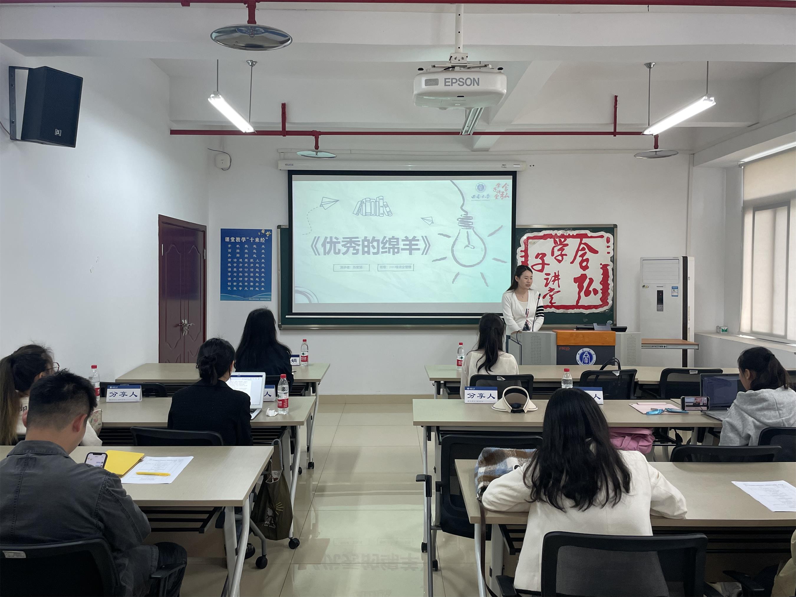 苏紫涵同学分享了《优秀的绵羊》一书。此书通过对美国常春藤盟校学生的现状研究,发现学生在传统和固有的模式中追求一流的成绩,不突破固有体制,如同绵羊一样老实跟着头羊,所以被称为优秀的绵羊。苏紫涵用大量的案例深入浅出地讲解了体制教育的局限,从现状产生原因、如何寻找自我、大学应该学什么、应该怎么做方面进行了阐述。希望同学们可以挣脱桎梏,找到真正的自我。