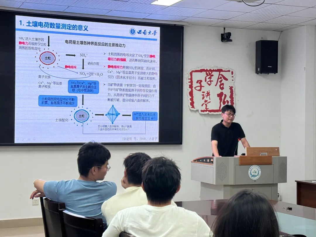 曹华同学宣讲的主题是《土壤电荷数量测定的意义、方法与应用》,固体颗粒表面的电化学性质在许多领域都有广泛的应用。电荷数量是胶体与界面化学中最重要的性质和最基本的参数之一。土壤电荷数量一般用每千克物质吸附离子的物质的量来表示。近期研究人员发现了一种基于界面原子轨道非对称杂化理论的表面电荷通用测定方法,并基于该方法研发了表面电荷通用测定仪。曹华同学在宣讲中介绍了表面电荷通用测定方法在黏土矿物和土壤上的应用,对一些试验结果进行展示和讨论