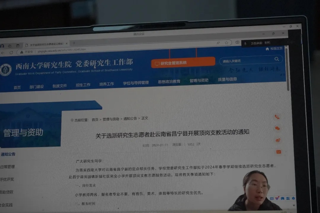 刘芳同学宣讲的主题是《云南省昌宁县顶岗支教志愿活动分享》,刘芳同学因身处支教岗位,所以宣讲过程采用的线上方式进行介绍,整个宣讲内容分为三个部分,一是介绍学校提供的顶岗支教志愿活动的类型及学校,让更多同学了解该项志愿服务;二是介绍其中一个支教地(云南昌宁新城完小)的校园、师生情况,让同学们简单了解该小学的情况;三是从学习、生活、工作、思想等方面分享顶岗支教活动发生的一些趣事及感悟。带领大家了解了顶岗支教的具体活动内容。