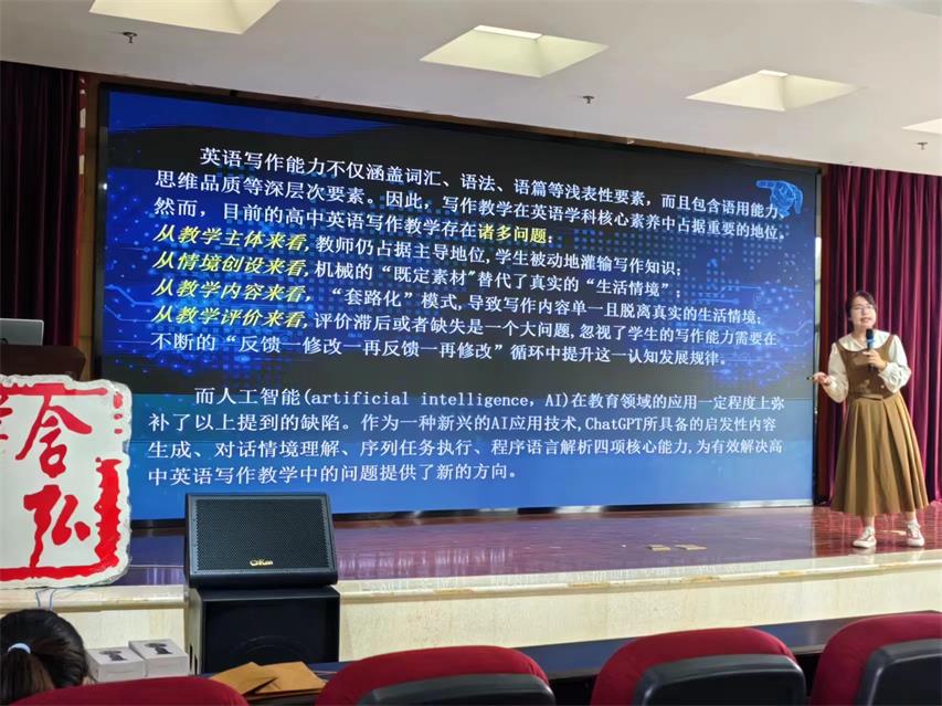 黄莺歌同学以“Chat GPT在高中英语写作反馈中的应用研究”为题,根据自身的实习经历,分享了Chat GPT在实际教学中的应用实例,证明了它在提供个性化反馈、丰富教学资源、提升学生语用能力方面的显著成效,为教育技术的创新应用提供了生动案例。