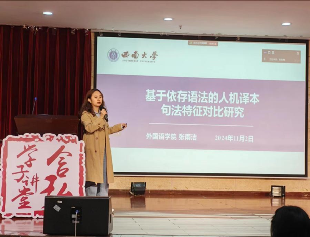 张雨洁同学分享的主题是“基于依存语法的人机译本句法特征对比研究”。她选取了20篇与语言学相关的论文中英文摘要,以中文摘要为原文,英文摘要为人工译文。此外,她还收集了谷歌翻译与ChatGPT-4o的译文版本,从计量语言学依存语法分析的专业角度出发,对学术文本翻译进行分析,并对比了人类翻译和机器翻译的句法特征,深入探讨了应用生成式人工智能模型ChatGPT来提高机器翻译质量的可能性。
