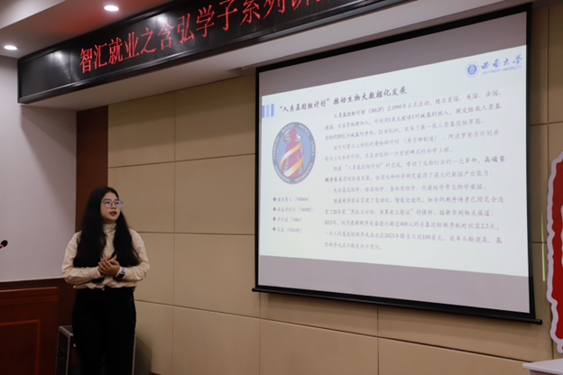 熊渝萍同学首先介绍了“人类基因组计划”推动生物大数据化发展的情况,接着阐述了生物信息学学科及其经历的不同发展阶段。随后她详细说明了生物信息学工具的开发与应用,特别提到了Bioinfokit等工具。此外,她还讲解了精准医学的概念和应用进展,并进一步分析生物大数据领域的就业现状。