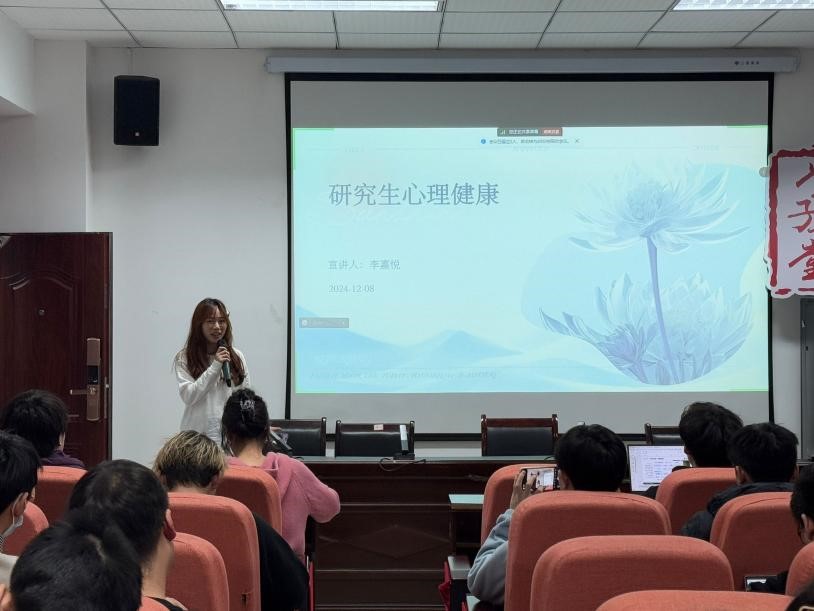 为引导大家释放压力,李嘉悦分享了研究生心理健康的相关内容,主要分享心理咨询技巧、常见的心理问题类型、心理疾病的预防技巧及学校心理健康支持资源等。她鼓励同学们在遇到问题时积极寻求帮助,通过心理咨询进行自我调节,也建议同学们以更平和的心态面对学习和生活中的挑战。