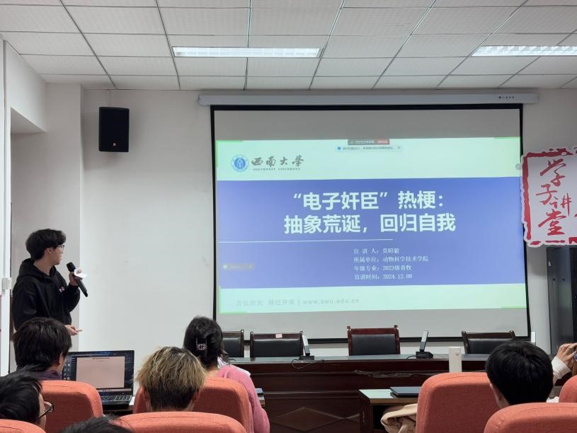 在分享会的互动交流环节,主讲人就有关主讲内容产生的疑惑与在座研究生进行了积极的互动。研究生辅导员陈雪松在活动总结中给予了积极的评价,赞赏大家能够以多元化的视角和宏观的视野去认识世界,通过一系列精彩多样的内容分享,充分展现了动科研究生们广泛的学术兴趣和爱好。他鼓励学生们积极参与学校及学院组织的各项活动,以此作为自我提升的平台;倡导大家积极贯彻“六有”新动科人才培养理念,致力于培养自己成为新时代的拔尖创新人才,拥有不懈的探索精神、独立的学习能力和前瞻的创新思维。