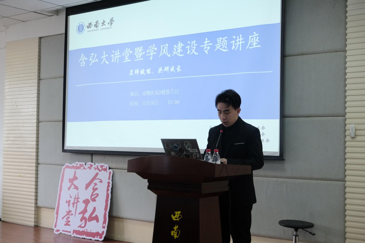 12月16日下午,含弘大讲堂之“名师赋能、共研成长”专题讲座在动物医院二楼报告厅举行。本次讲座邀请动物医学院王鲜忠教授,水产学院陈拥军副教授、王晨旭老师担任主讲人。活动由水产学院武元培同学主持,各年级研究生踊跃参与其中。