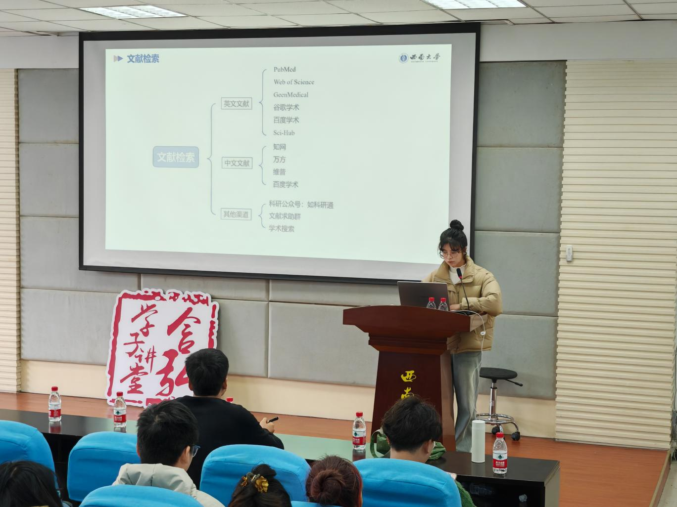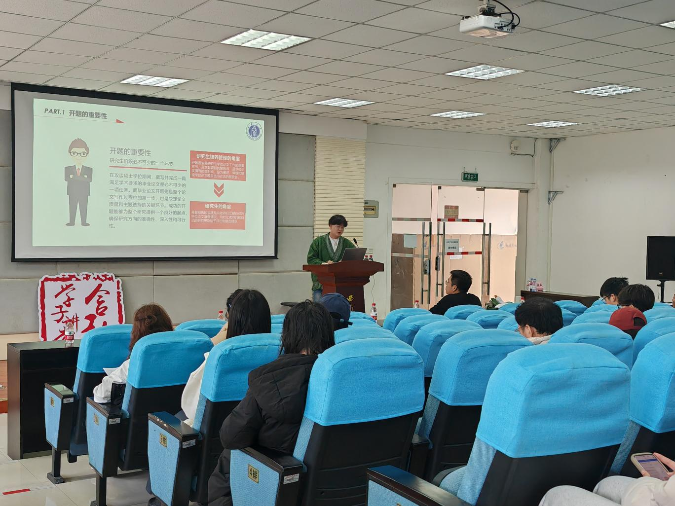 梅静围绕硕士研究生科研创新项目申请、文献检索和心理健康三大板块进行分享。她较为全面地介绍了科研项目申请的准备工作,包括选题、文献综述和研究计划的制定,随后详细讲解了申请材料的提交流程。接着,在文献检索技巧方面,她强调了选择检索工具、制定检索策略以及整理文献的重要性。最后,梅静就时间管理、压力调节和重视心理健康等方面提出了实用建议,鼓励同学们合理平衡学业与生活。