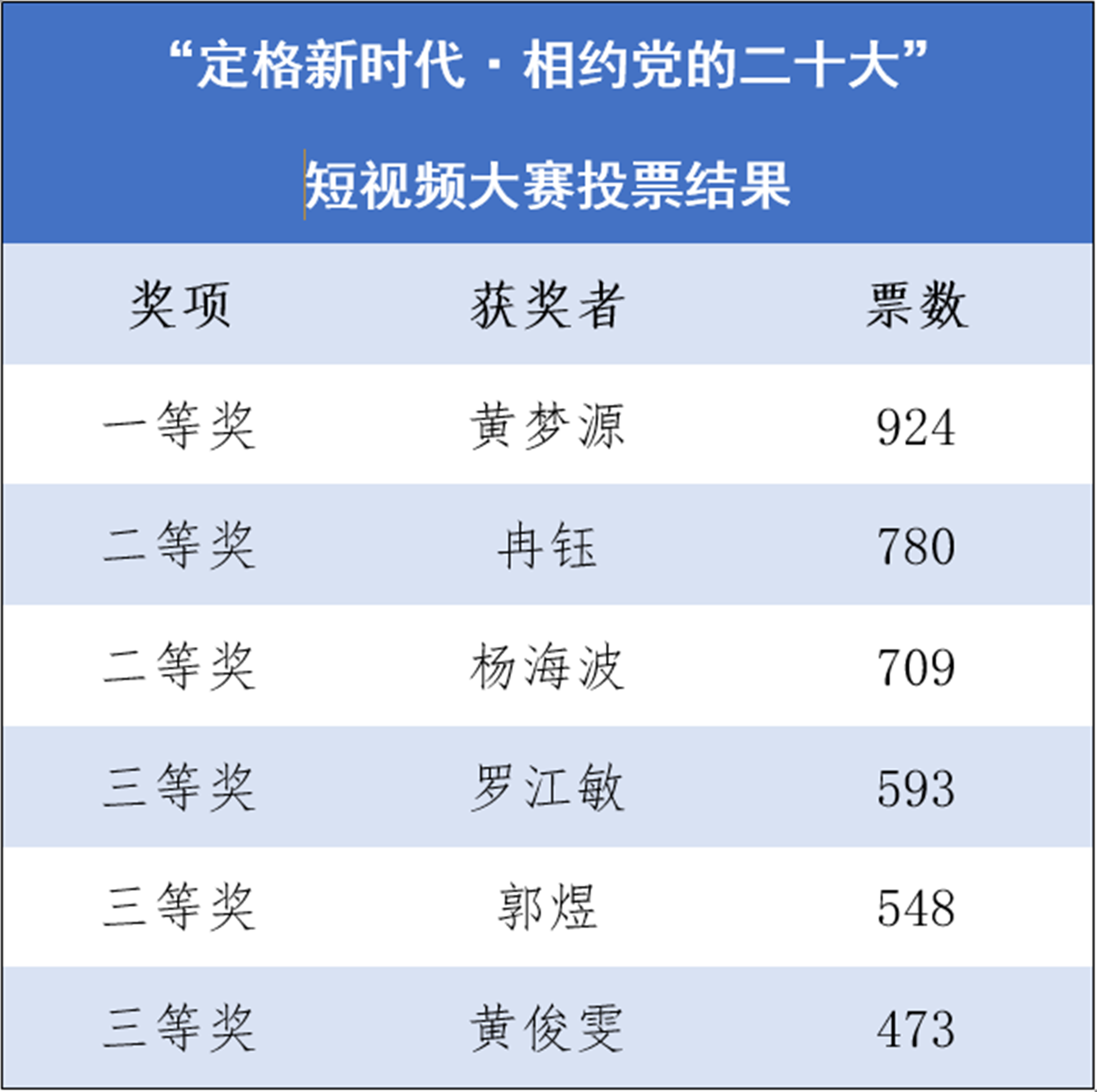 为体现活动的专业度和大众认可度,扩大活动的影响力,5月24日,我院特在“西大外院研会”微信公众平台发布了短视频作品和投票链接。推送一经发布,同学们积极参与、热情转发,浏览人数超过1600人次,有效投票7706票。在两天时间里,各家票数你追我赶、难分伯仲。最终,六名同学脱颖而出,投票结果如下: