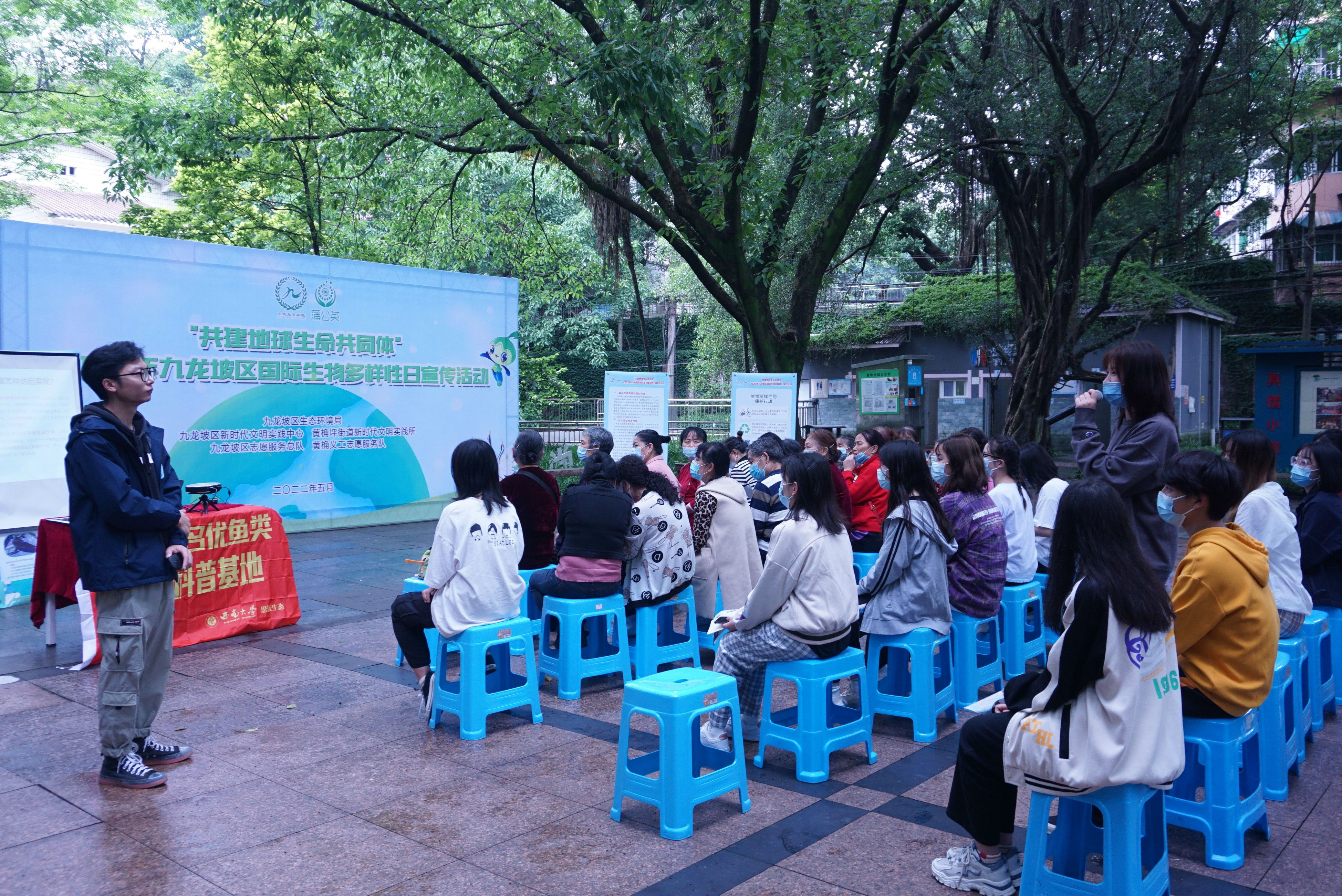 2022年5月19日,正值第29个国际生物多样性保护日来临之际,betway西汉姆联水产学院研究生、嘉陵江名优鱼类研发科普人员林航宇、孟文旭前往重庆市九龙坡区,参加由九龙坡区生态环境局主办的“共建地球生命共同体”长江多样性保护宣传活动,现场宣讲长江生物多样性大保护,科普对象为重庆电力高等专科学校学生及九龙坡区小湾社区居民。