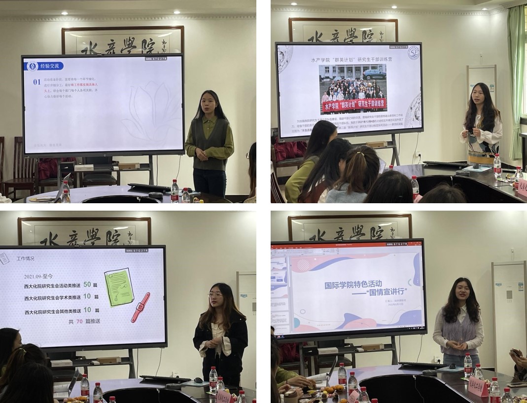 为加强各学院研究生干部间的交流学习,提升学院研究生会的服务能力,丰富学院活动内容。近日,由水产学院、外国语学院、化学化工学院和国际学院四个学院研究生会共同举办的“分享交流促进步,凝心聚力共提升”主题经验分享会于水产学院会议室成功开展。